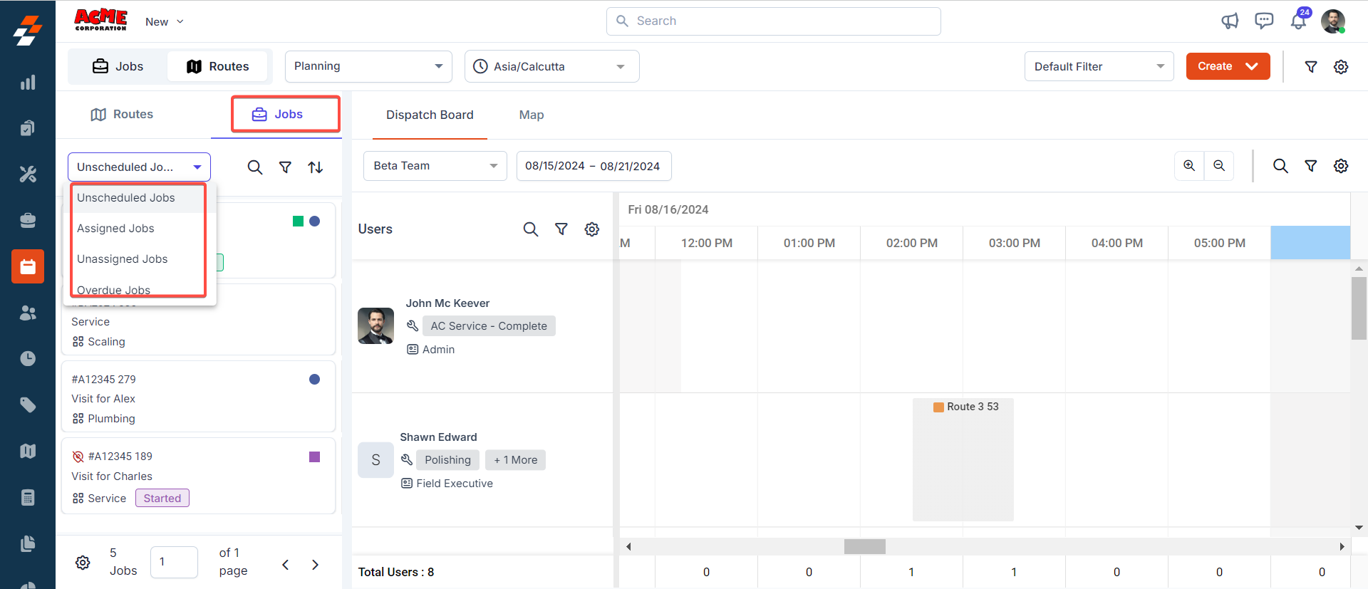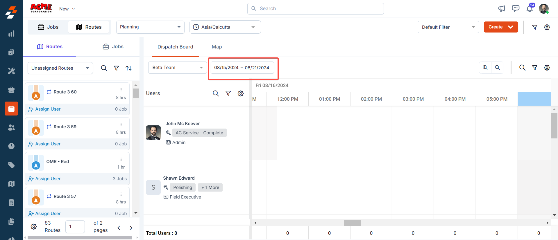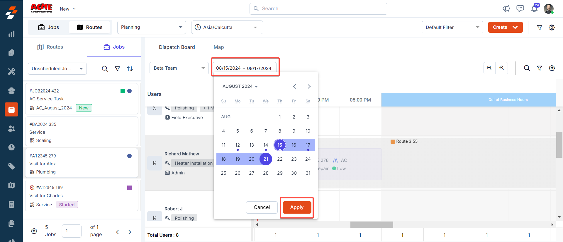 Using the scheduler view (dispatch board), you can plan, and schedule routes/jobs based on the availability of technician belonging to teams across a date range. To do so, follow these steps: