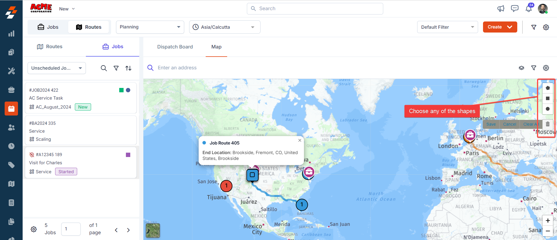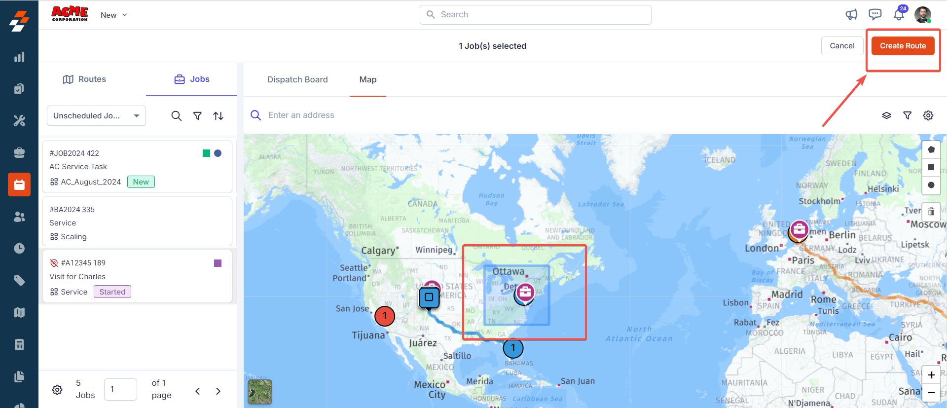 2. Once the shape has been chosen, drag and select the job(s). After selecting the job(s), click the “Create Route” button at the top right corner.