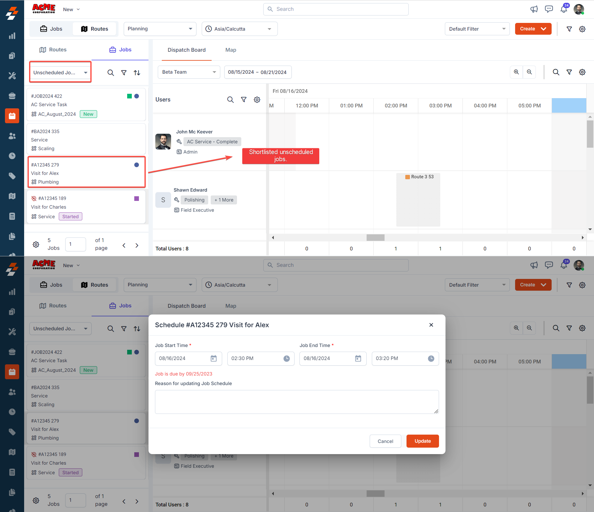& drop to the schedule), followed by assigning jobs to the scheduled route based on the route capability and proximity of a job to an existing route (drag