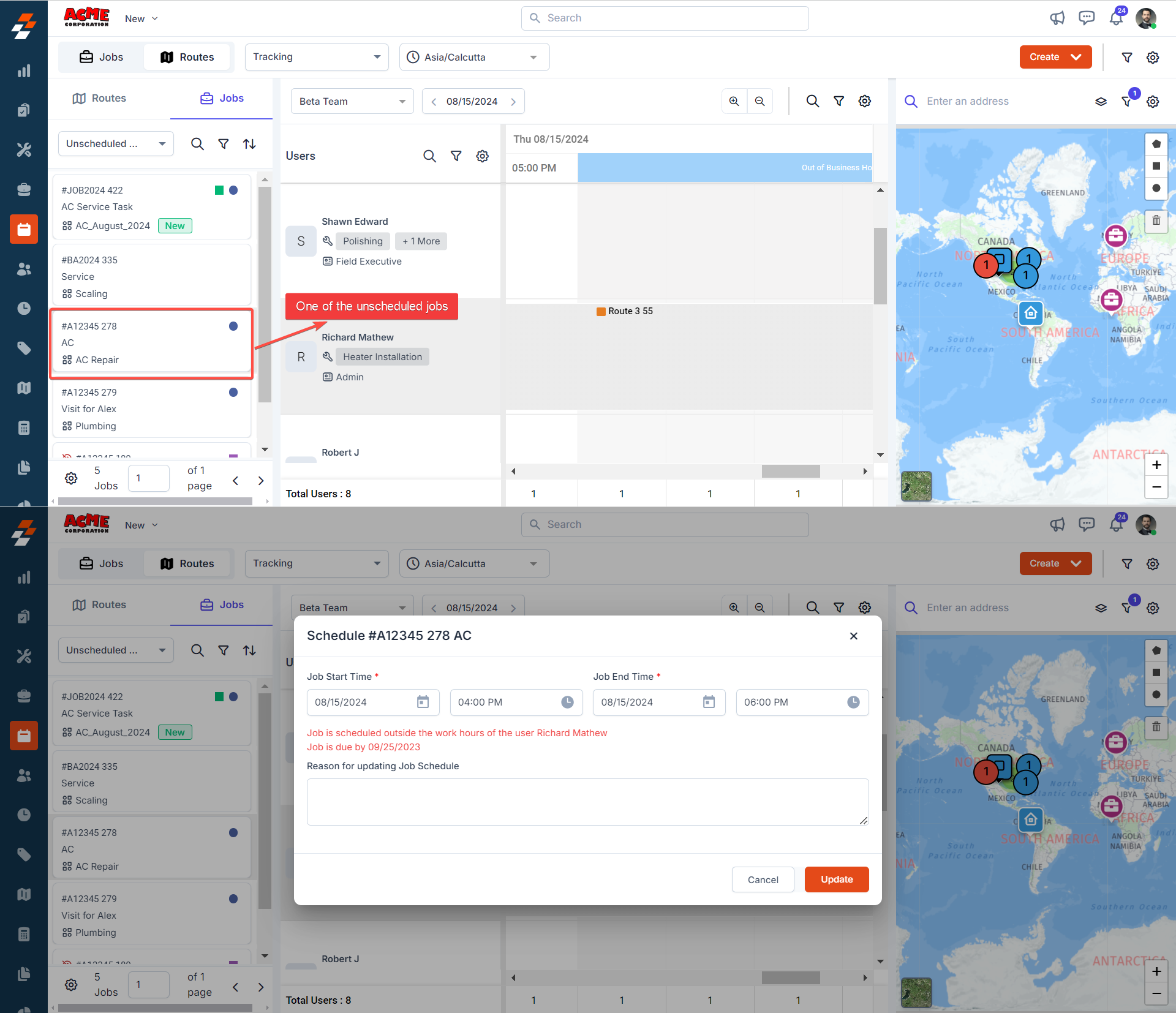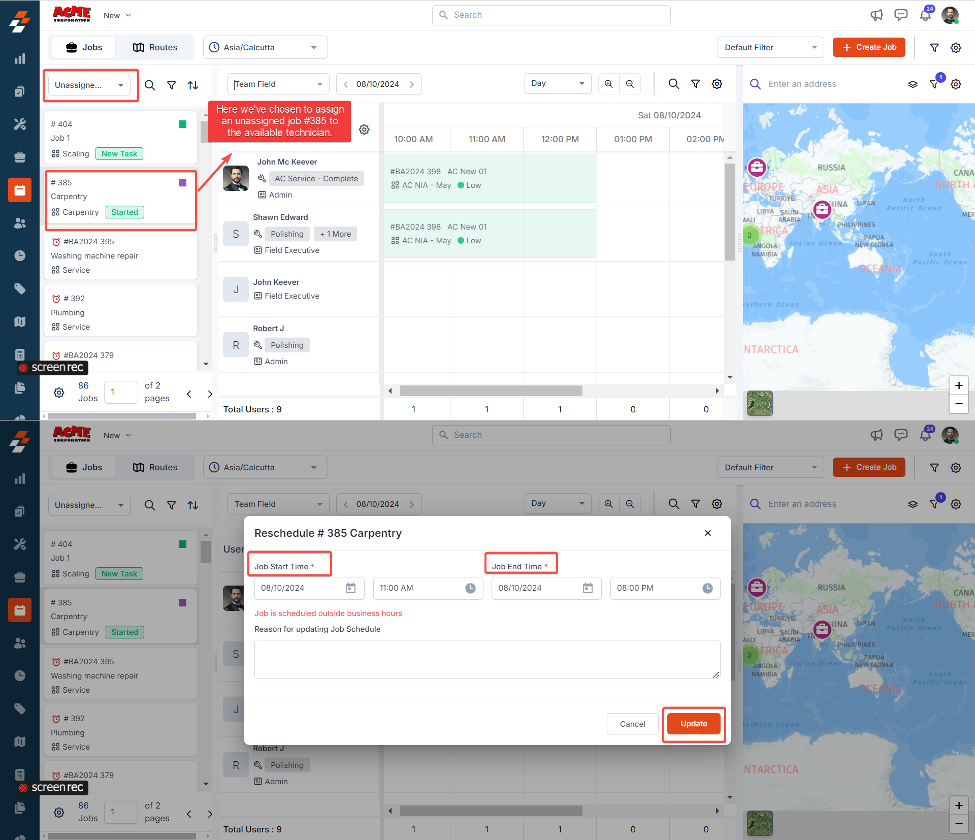 Note: You can also reschedule the job duration while assigning to the technician's route.