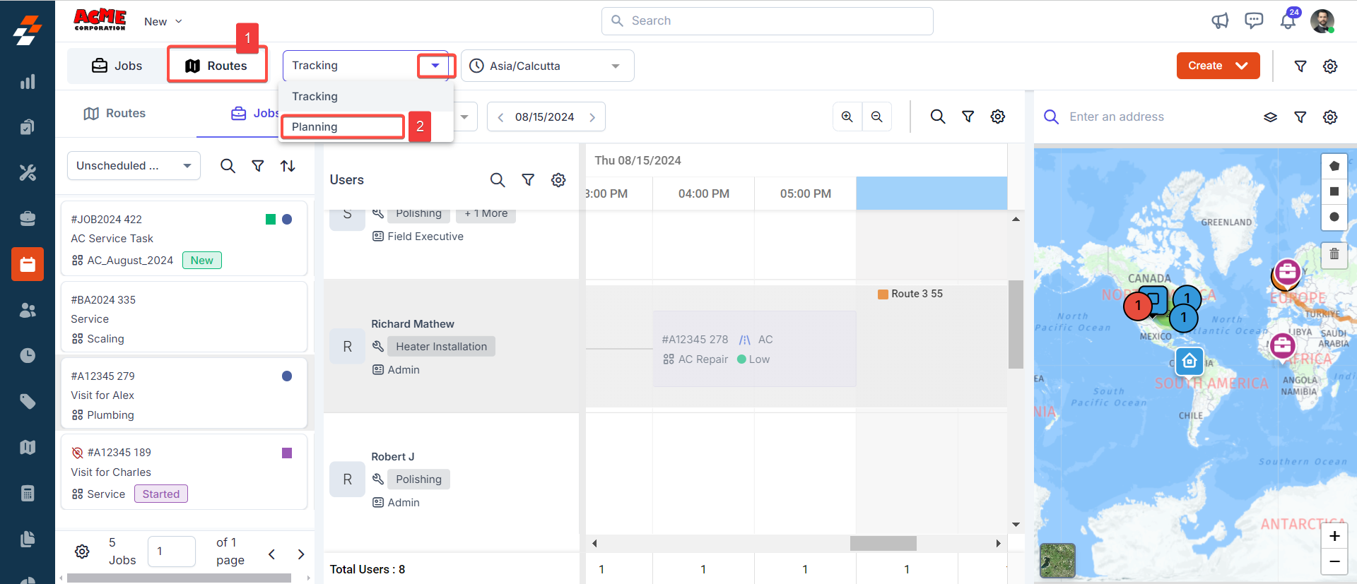 Plan and Schedule Route to the Available Technician (Planning View)