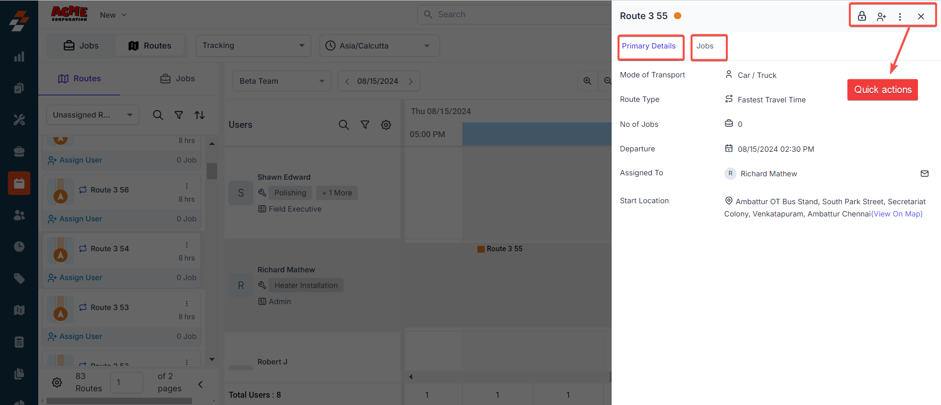 - Primary Details: This includes the route color, mode of transport, route type, and no. of. Jobs were assigned to that route, technicians were assigned, and so on.