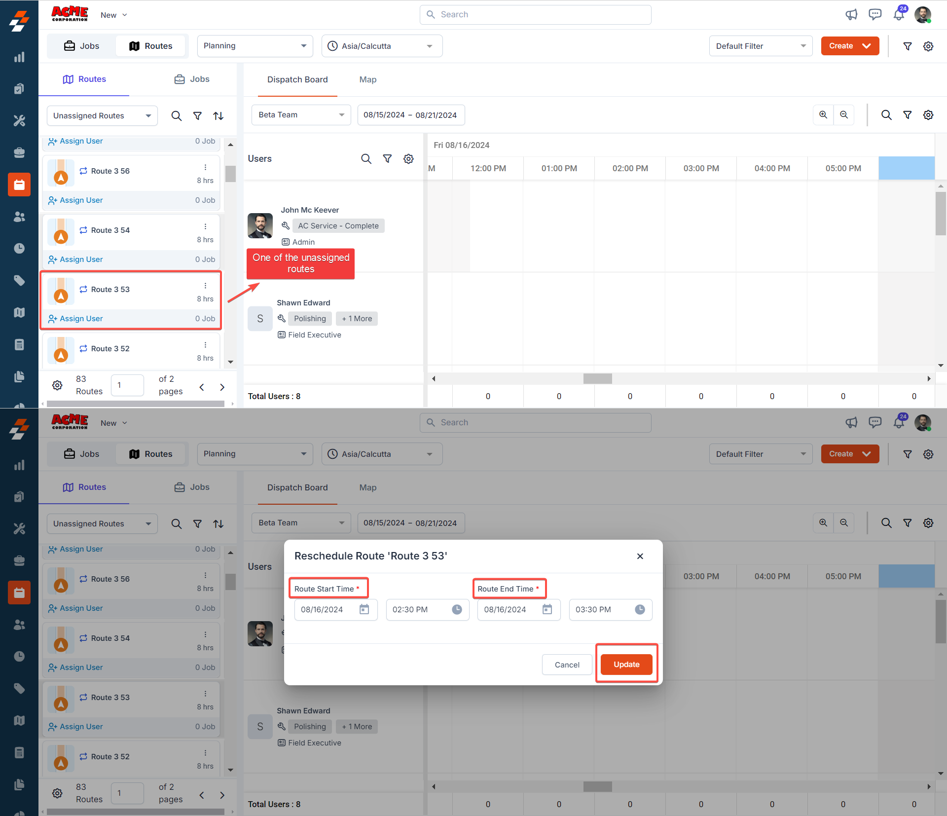 Note: When dragging and dropping the route from the dispatcher queue to the available technician in the scheduler, you can schedule/reschedule the route start & end date and time.