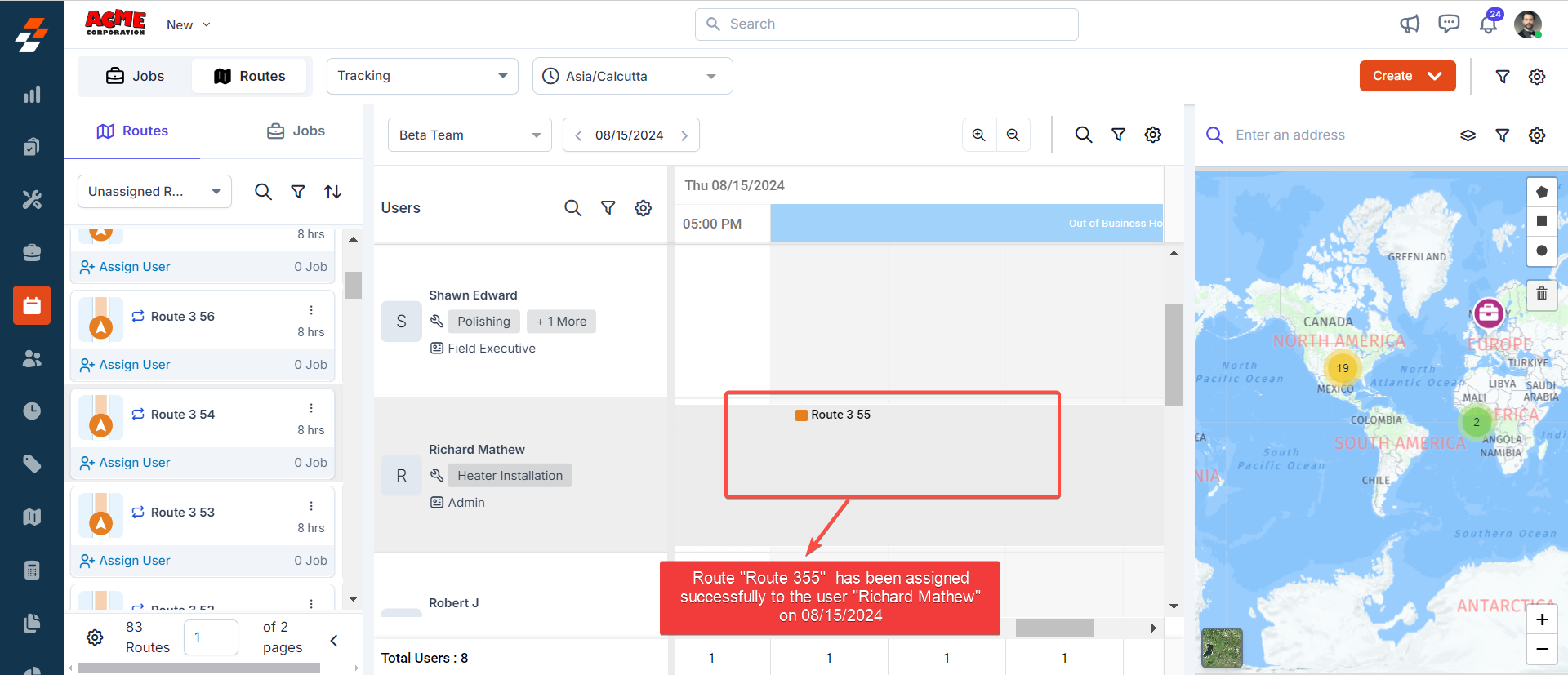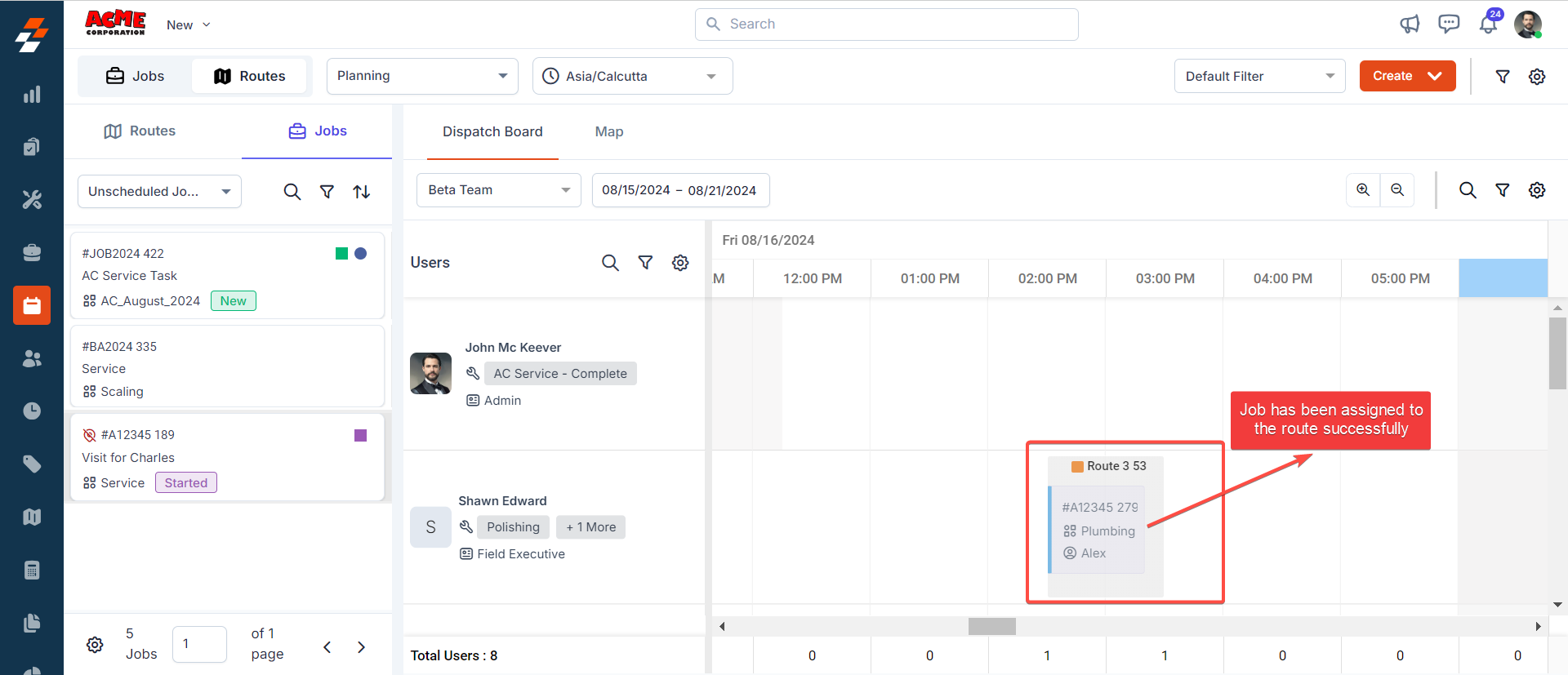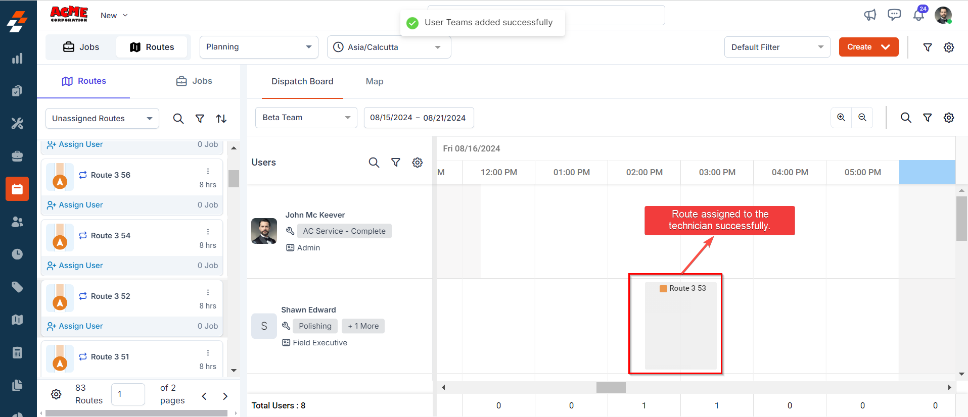 5. The Route will be assigned successfully to the technician for the selected date.
