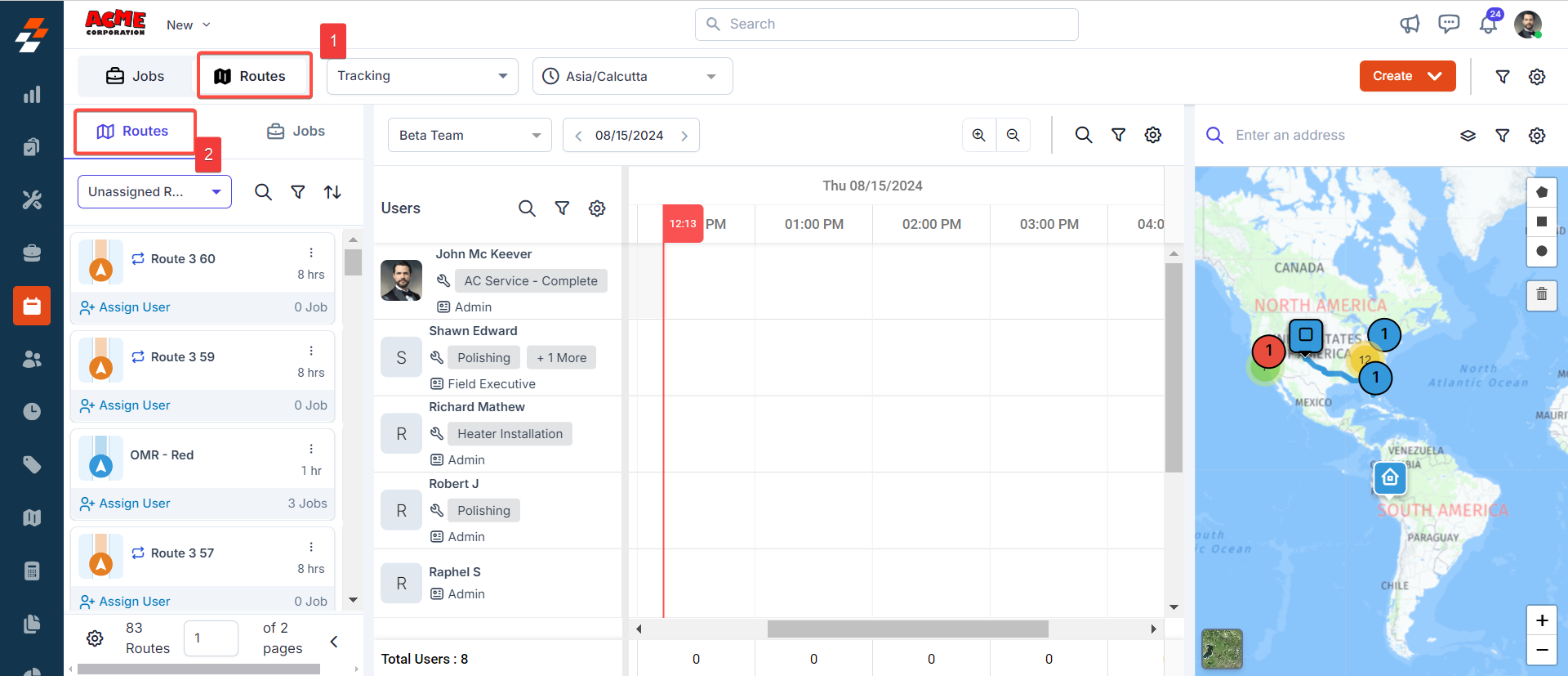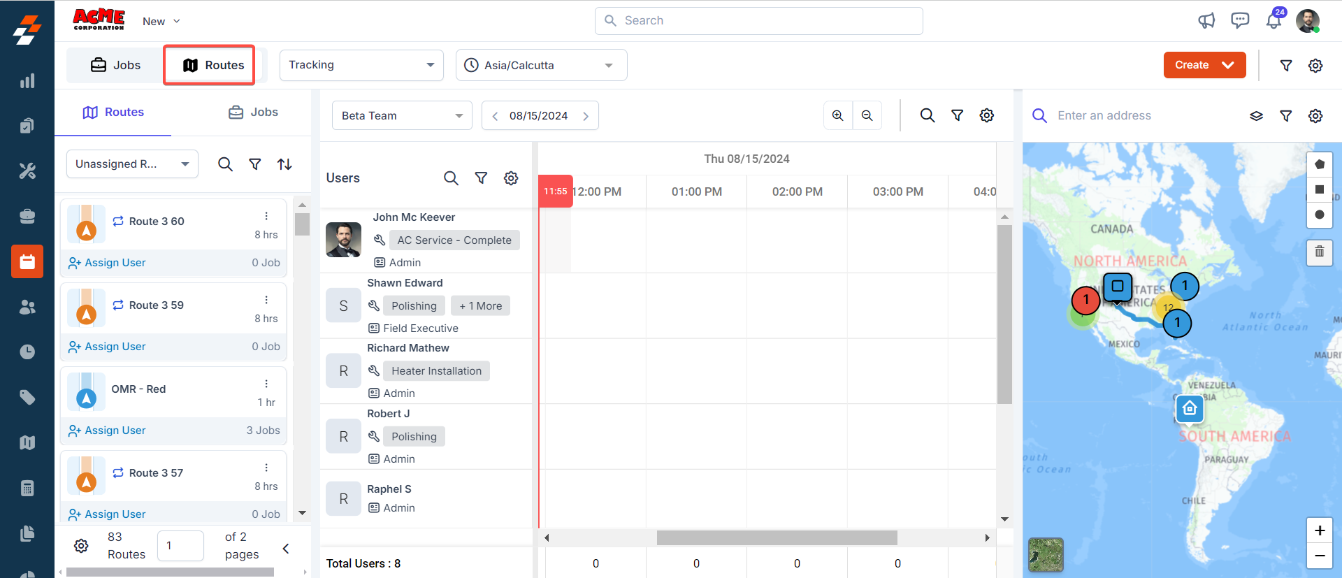 Efficiently assign multiple jobs to a route by balancing key factors such as overall route duration, job schedules, and total travel time between jobs based on the mode of transport (e.g., car, truck, semi-truck). This can be done using either the scheduler or the map.