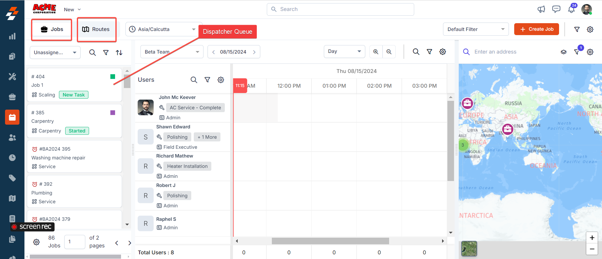 Note: Simultaneously, you can view locations of shortlisted jobs from the Dispatcher Queue and jobs assigned to technicians in the Scheduler on the map. You can also assign the technician to the job directly from the map.
