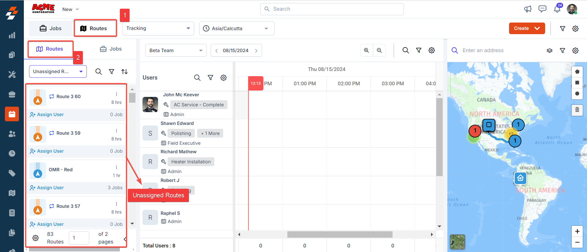 Unassigned Routes refer to predefined pathways that have not yet been allocated to a specific technician. From the dispatch board, you can assign an unassigned route to an available technician based on their availability and proximity to current jobs/routes for the selected date.