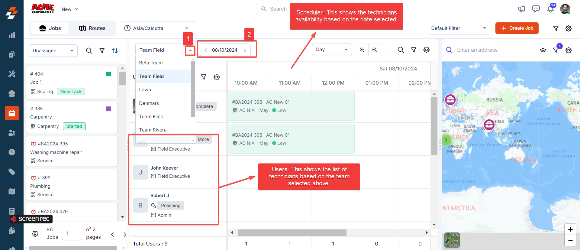 to schedule the job. Based on the team selected, you can view the technicians within