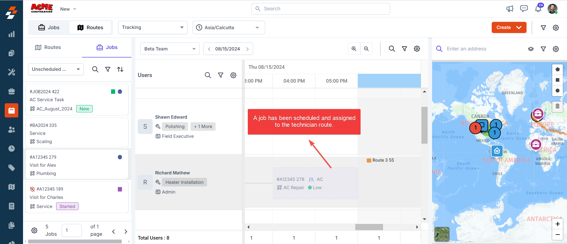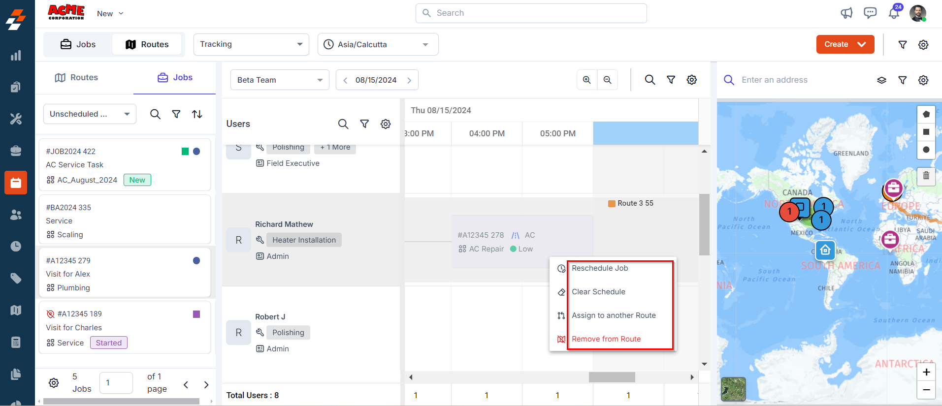 4. Upon successfully assigning a job to the technician's route, you can perform certain quick actions such as rescheduling job, assigning job to another route, removing job from the route and so on by right-clicking on it.