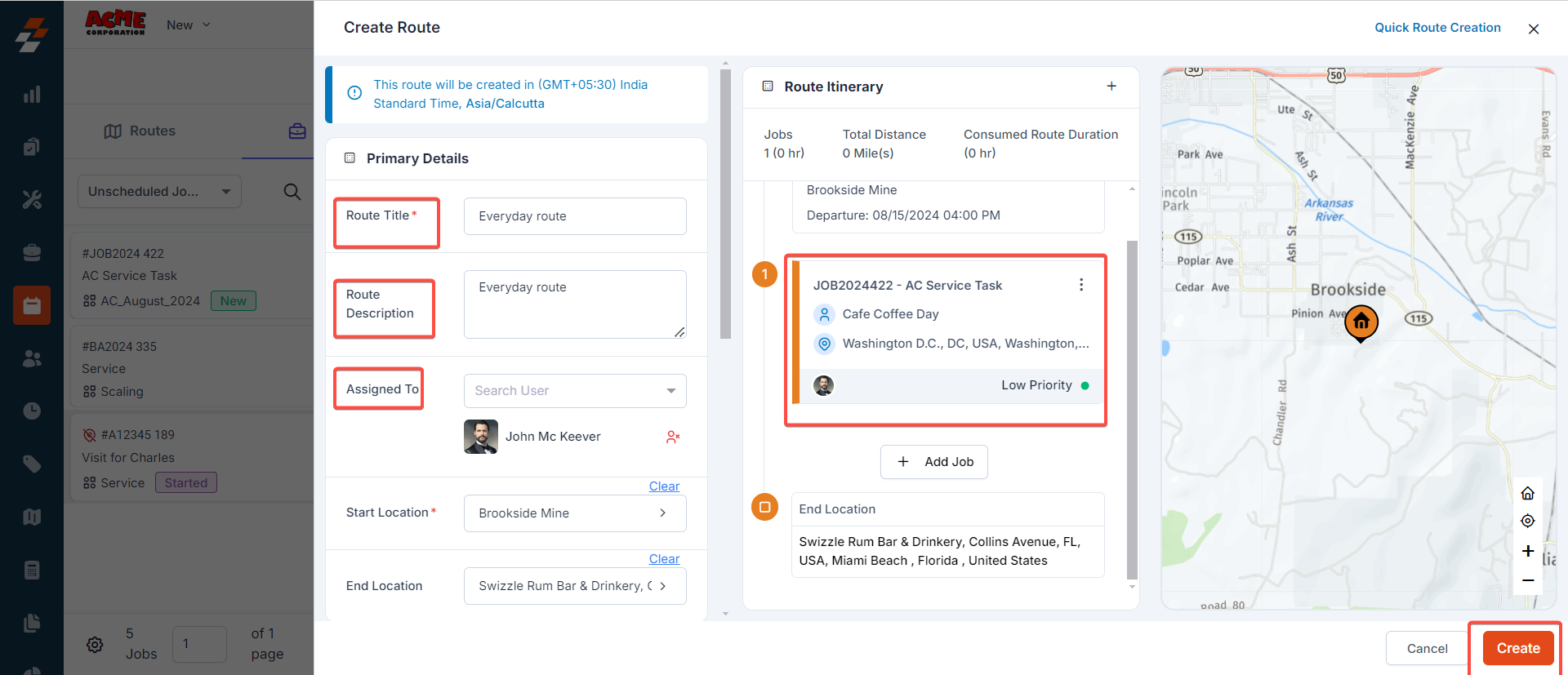3. Provide route details such as route name, color, route type, star location, end location, etc., and click the "Create" button. The route will be created successfully for the selected job on the map.