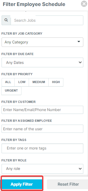 Filter By Customer: Entering a customer's name in this filter will show only the jobs scheduled for that customer.