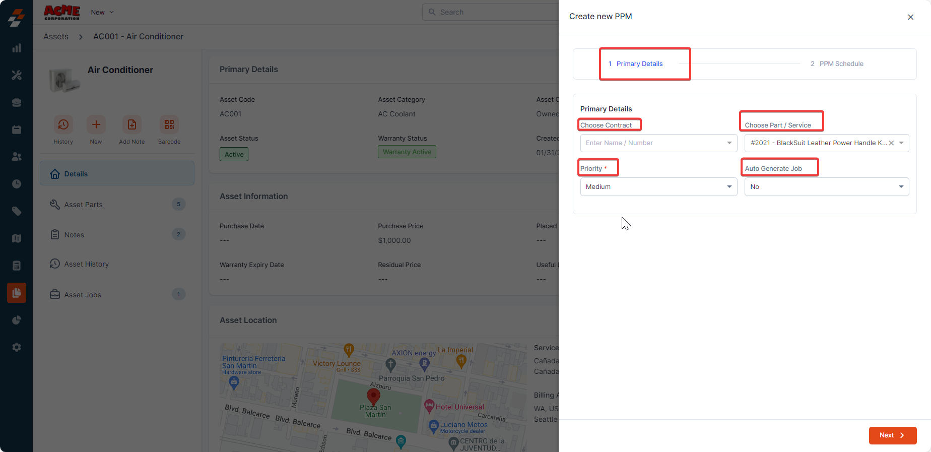 Choose Part / Service (Optional Field): Select a part or service associated with the contract to include in the PPM.