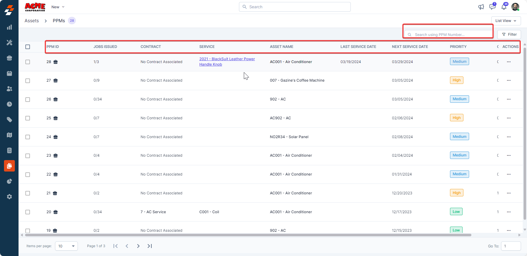 3. You can access all PPMs for assets, including PPM ID, name, last service date, next service date, and more. You can also use the search bar to search and view specific asset's PPM details.