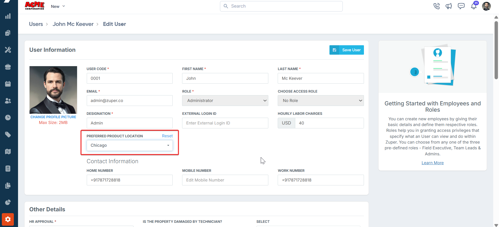 - Choose Access Role: The User's access role signifies the level of access in the "Zuper" console.