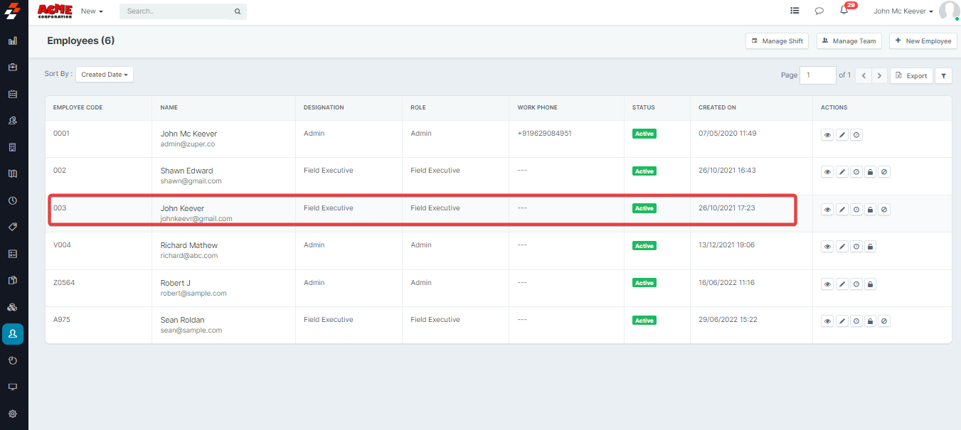 1. Log in to Zuper Account. Select the "Employees" module from the left panel and choose the user you want to delete.