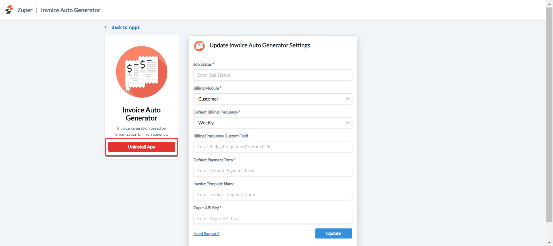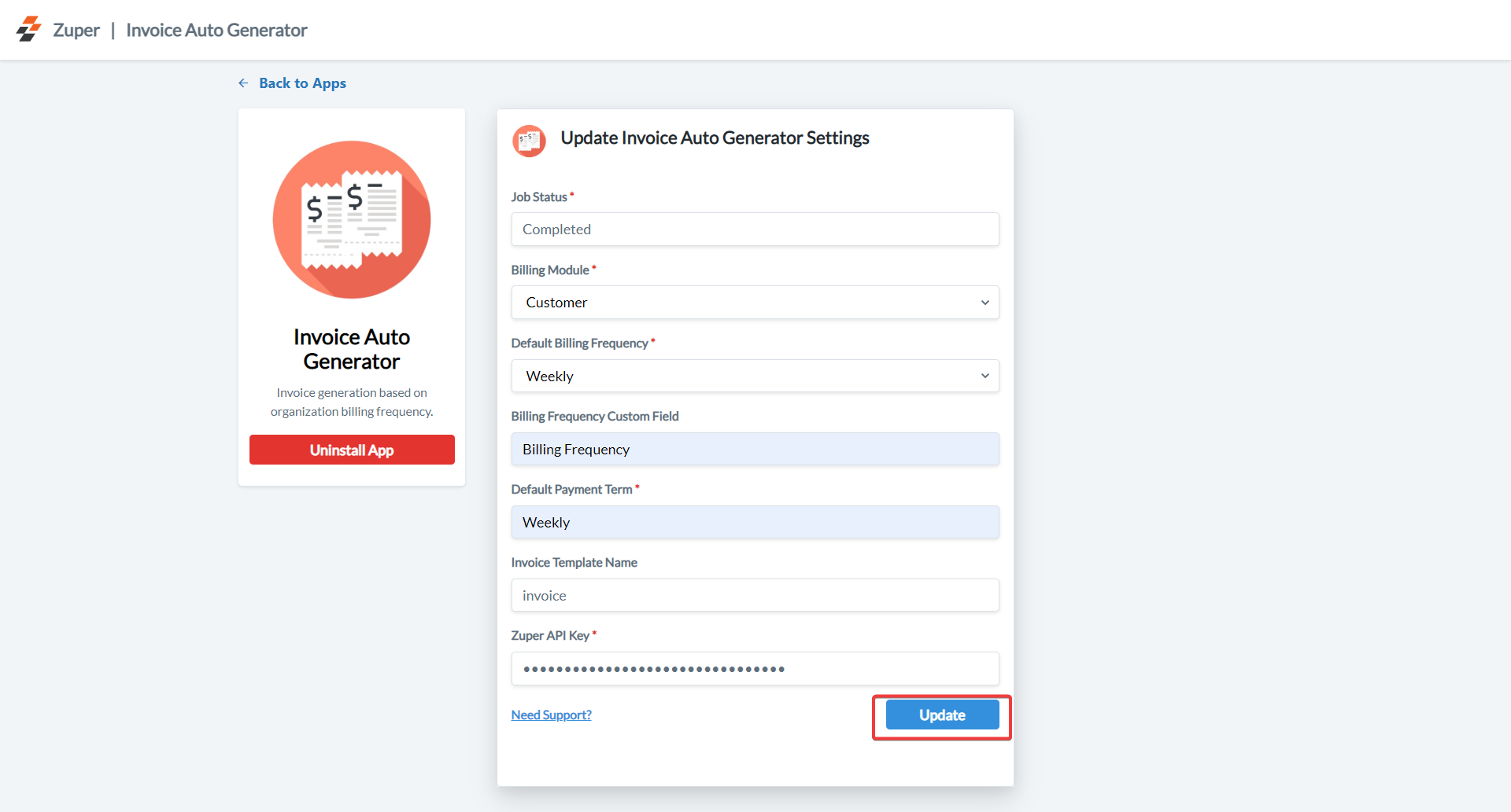 Select the “Update” button to connect Auto Invoice Generator app with Zuper.