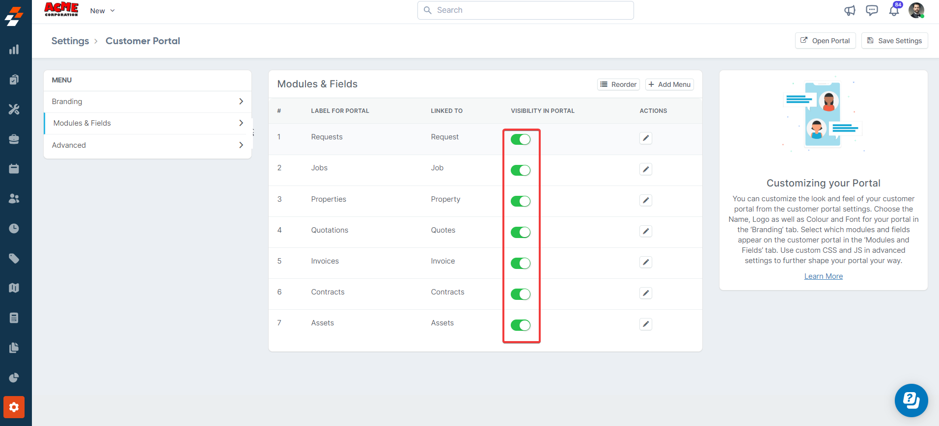 enabled to configure the customer portal, including Branding, appearance,
