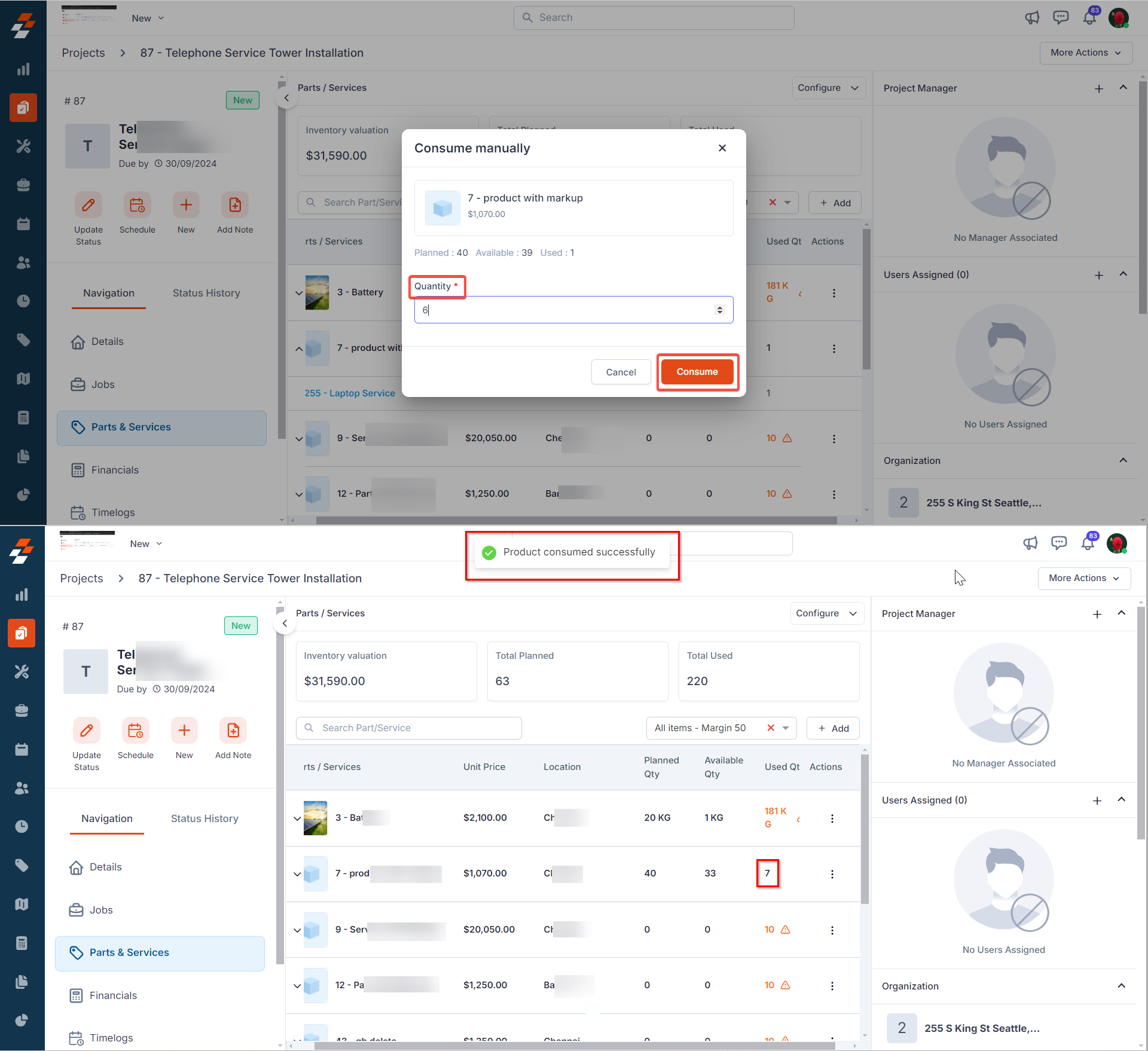 2. Enter the consumed quantity and click the “Consume” button. Based on the input, the specific parts/services "Used quantity" will be updated.