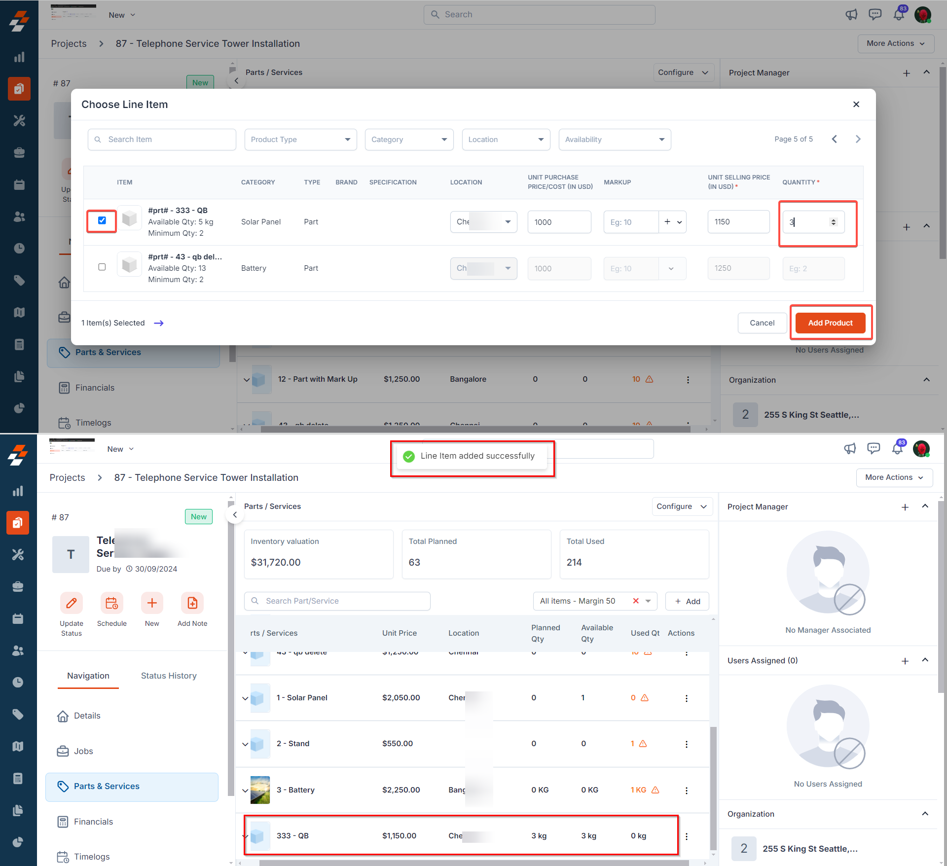 2. Choose the desired parts or services with quantity and click the “Add Product” button. The Parts & Services will be added successfully to the project.