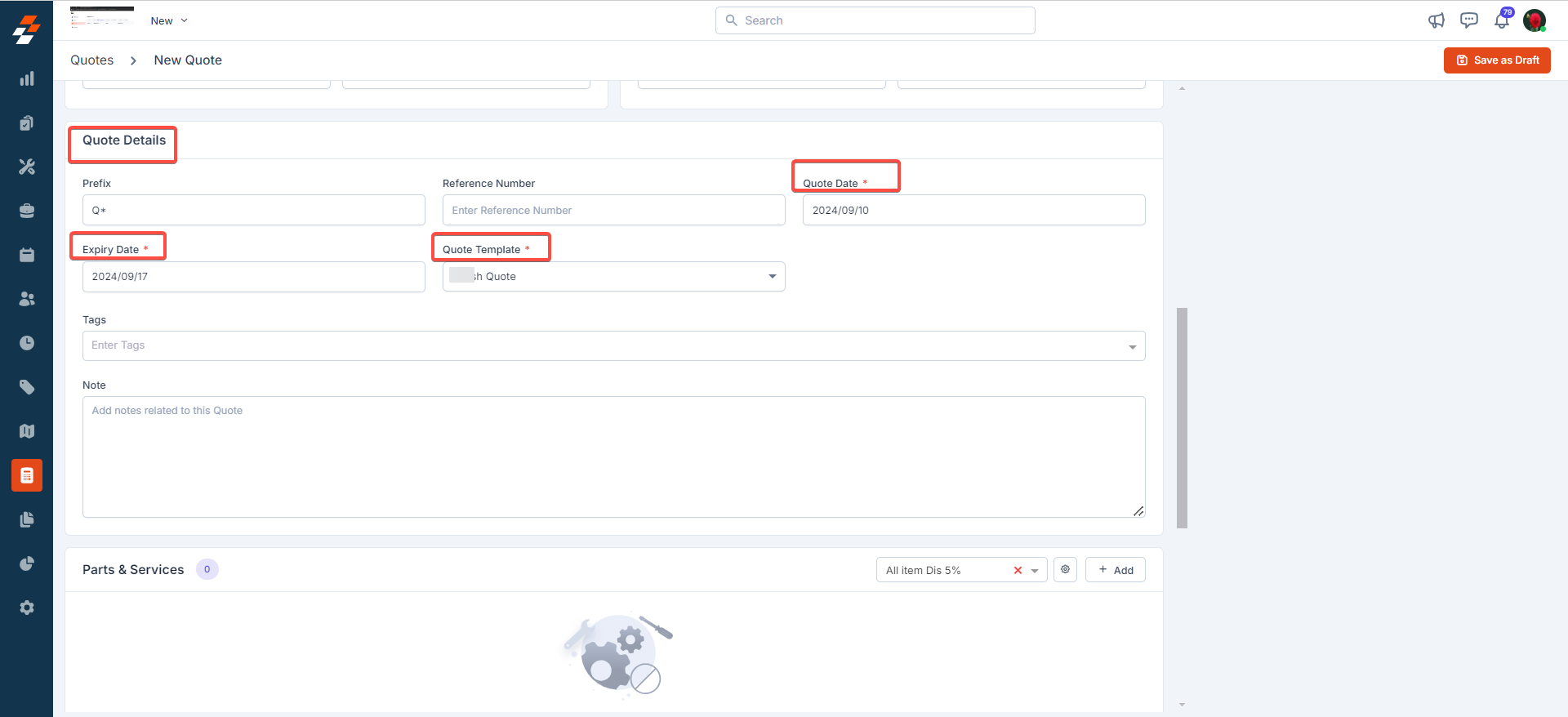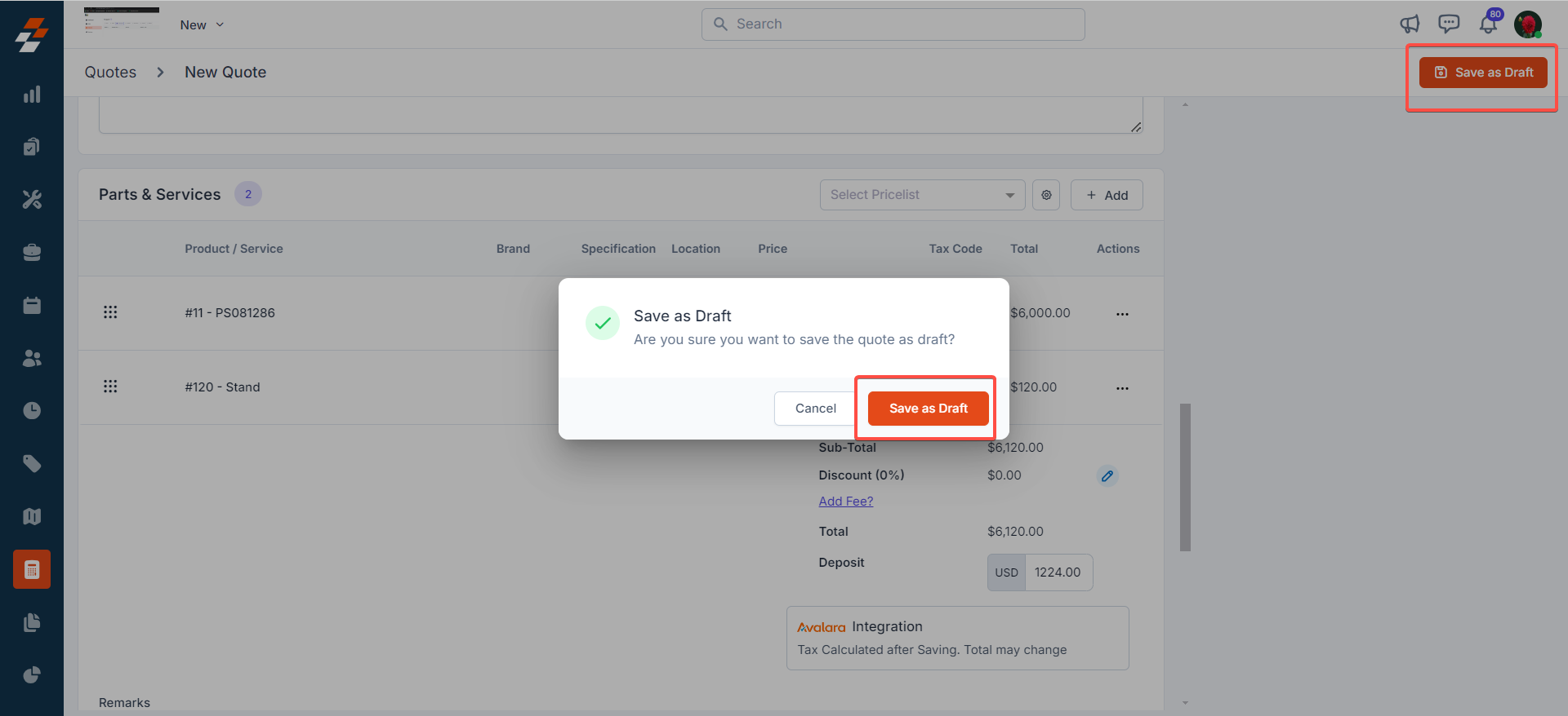 5. Click the "Save as Draft" button at the top right corner of the page after adding the required parts & services to save and send the quote to the selected customer/organization.