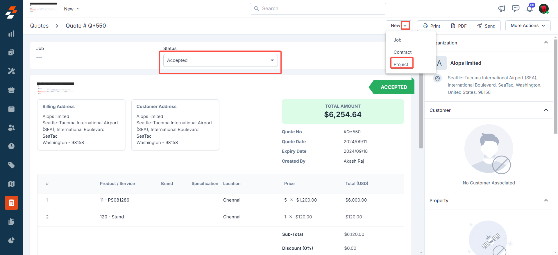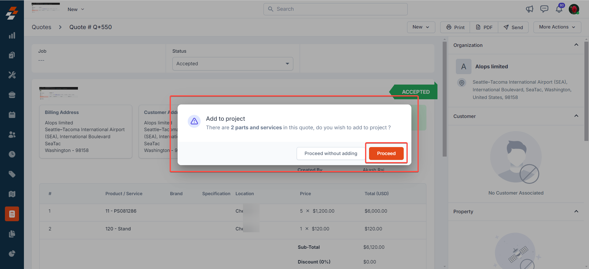 Additionally, you can directly associate the necessary parts or services required to complete jobs within the project from the quote accepted by the customer. This integration reduces the risk of manual errors and ensures that the project is completed in alignment with the agreed-upon quotation.