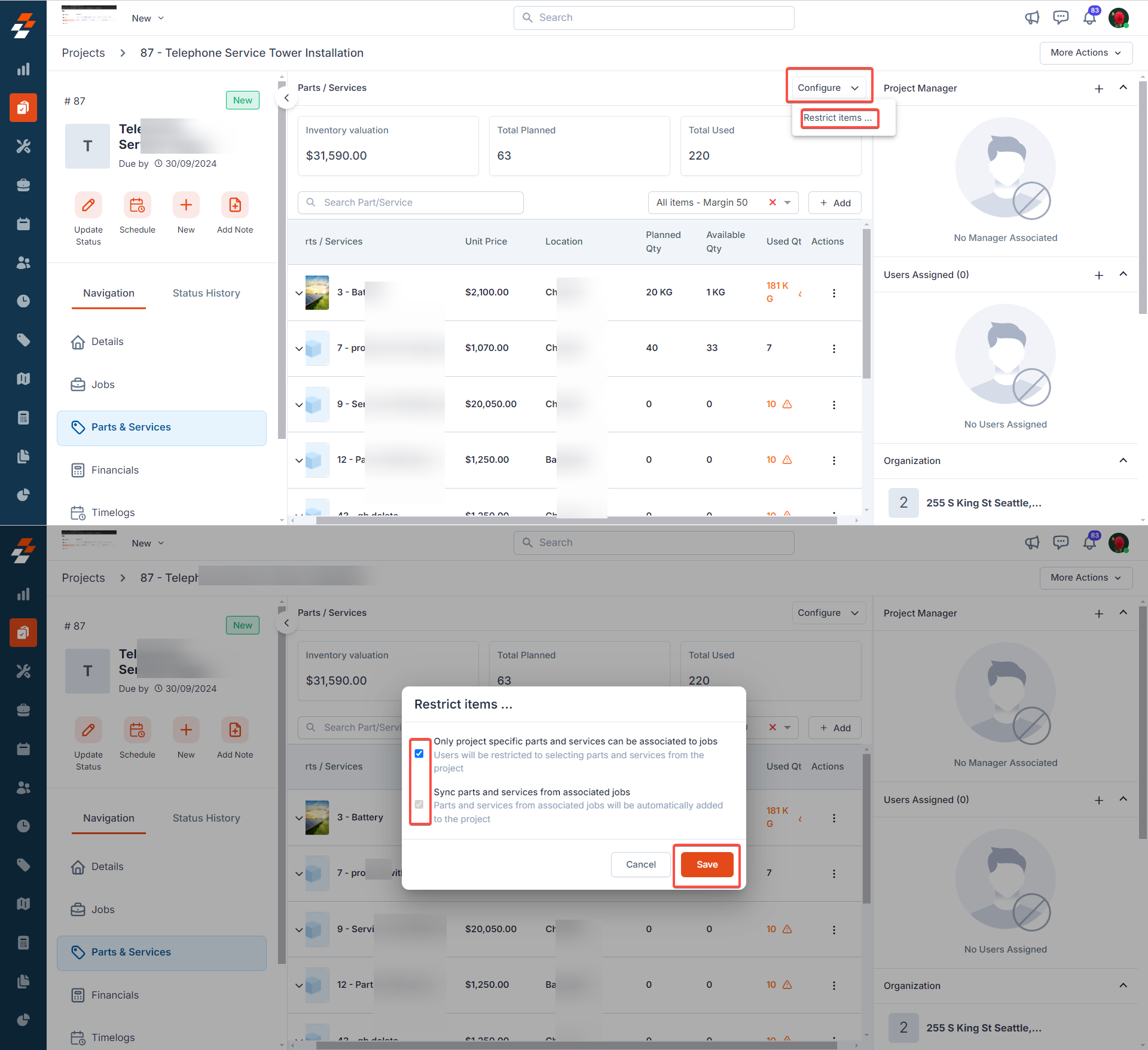 1. Only Project-Specific Parts and Services: When this option is enabled, users can only associate parts and services that were added within the project to jobs while creating them. They will not be able to add parts and services from outside the project.