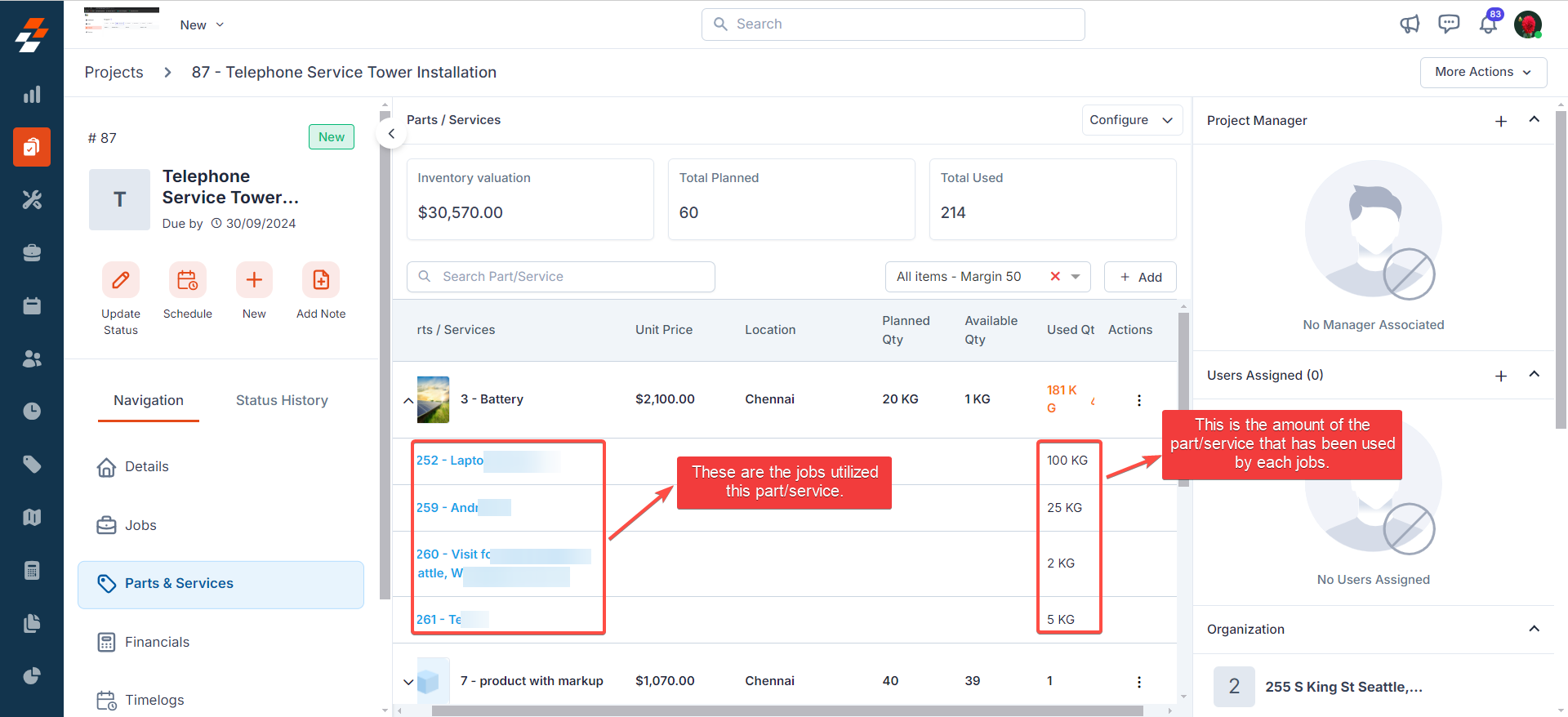 3. Click any of the parts or services to view the jobs within the project that have consumed the specific parts and services.
