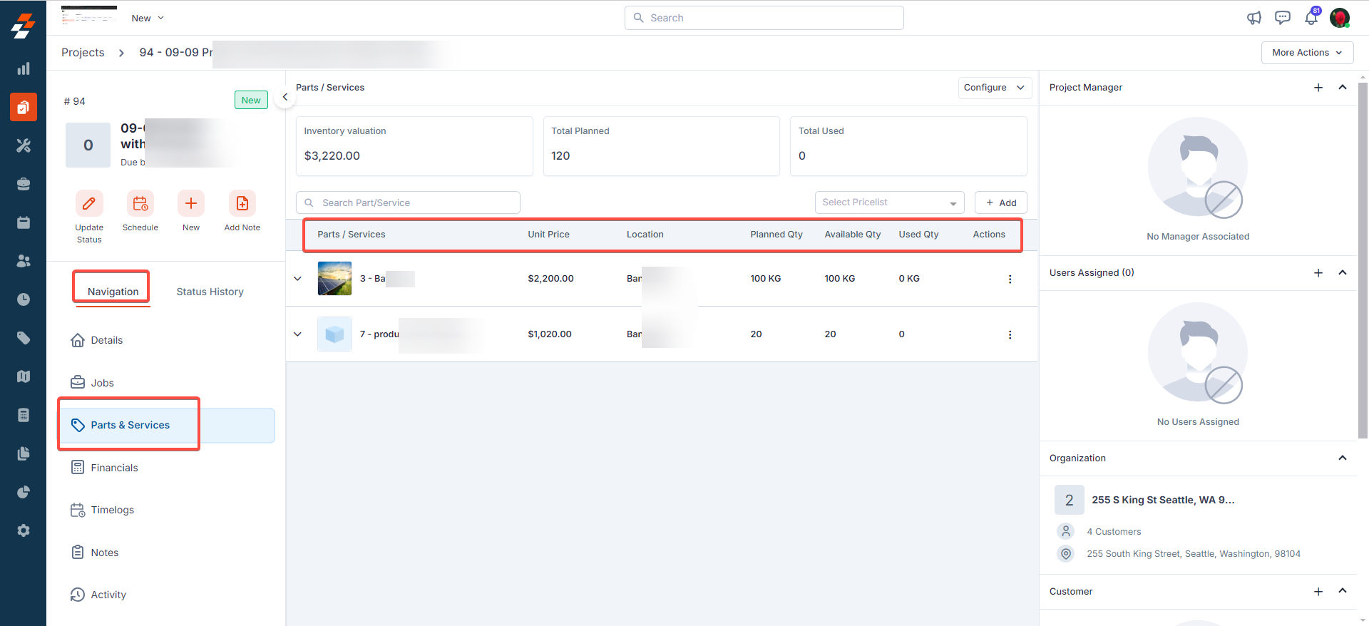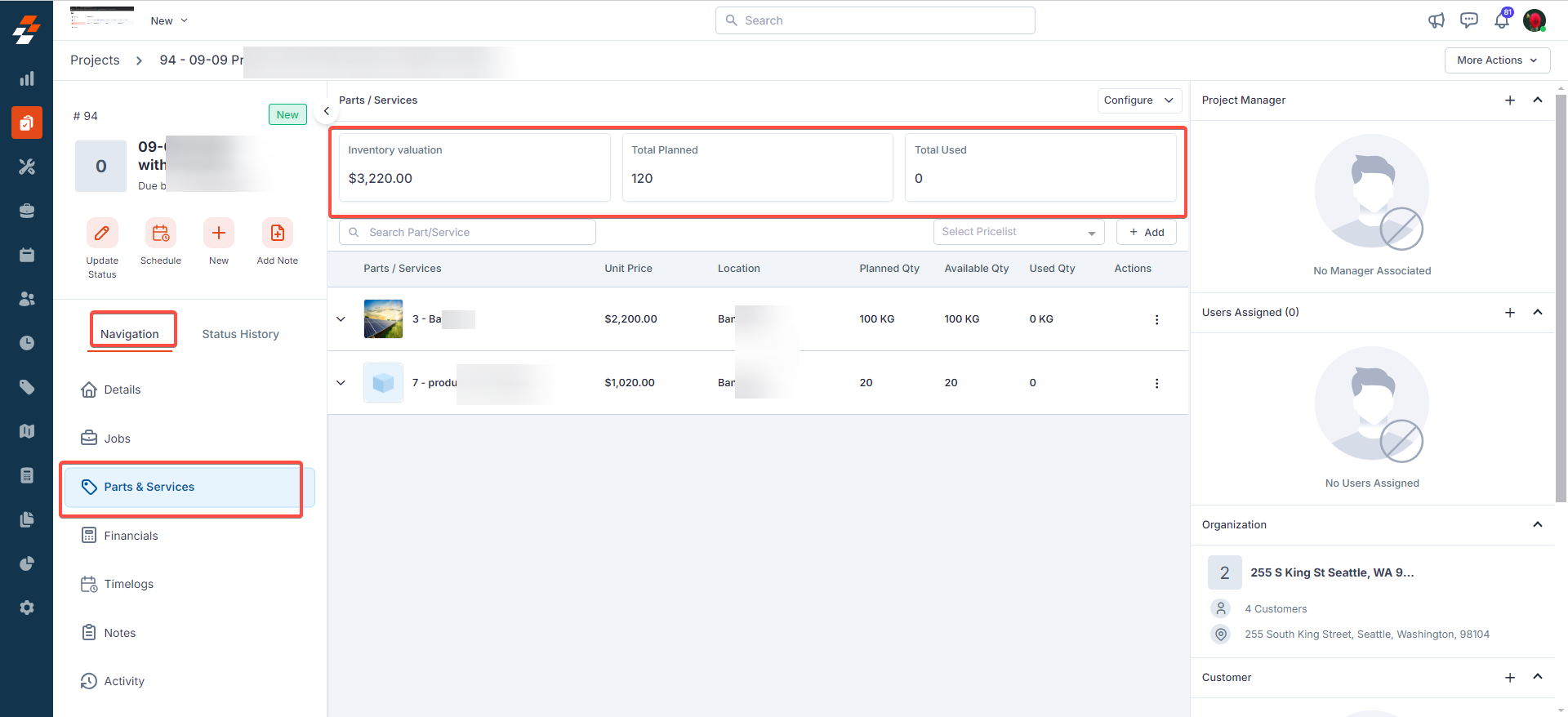 The Parts & Services section within the Projects module allows you to efficiently track the cost of parts and services used across jobs within a project. This feature also serves as a foundation for budgeting, helping you to monitor both the planned and actual quantities of products consumed throughout the project.