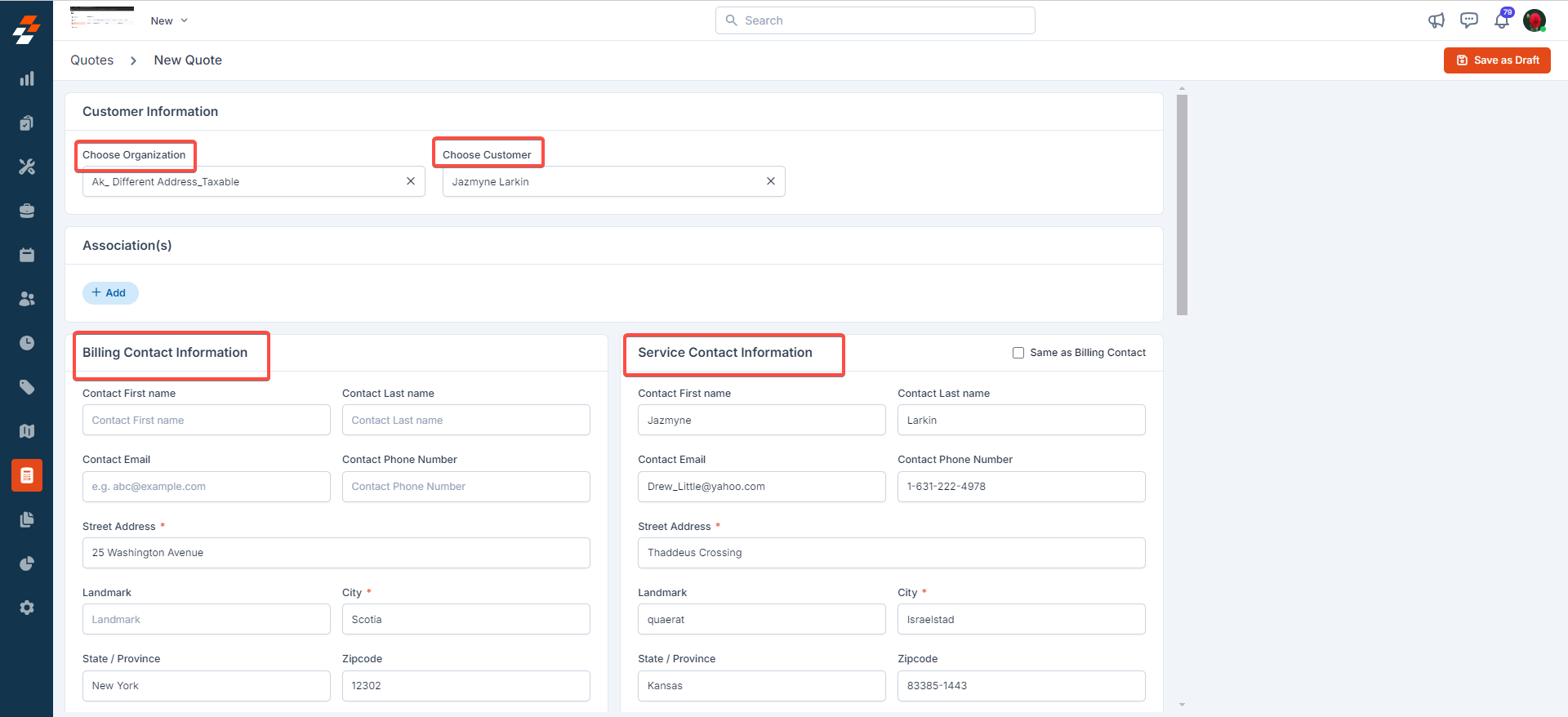 2. Choose either "Customer" or an "Organization." The billing and service contact information will be filled in automatically based on the organization or customer chosen.