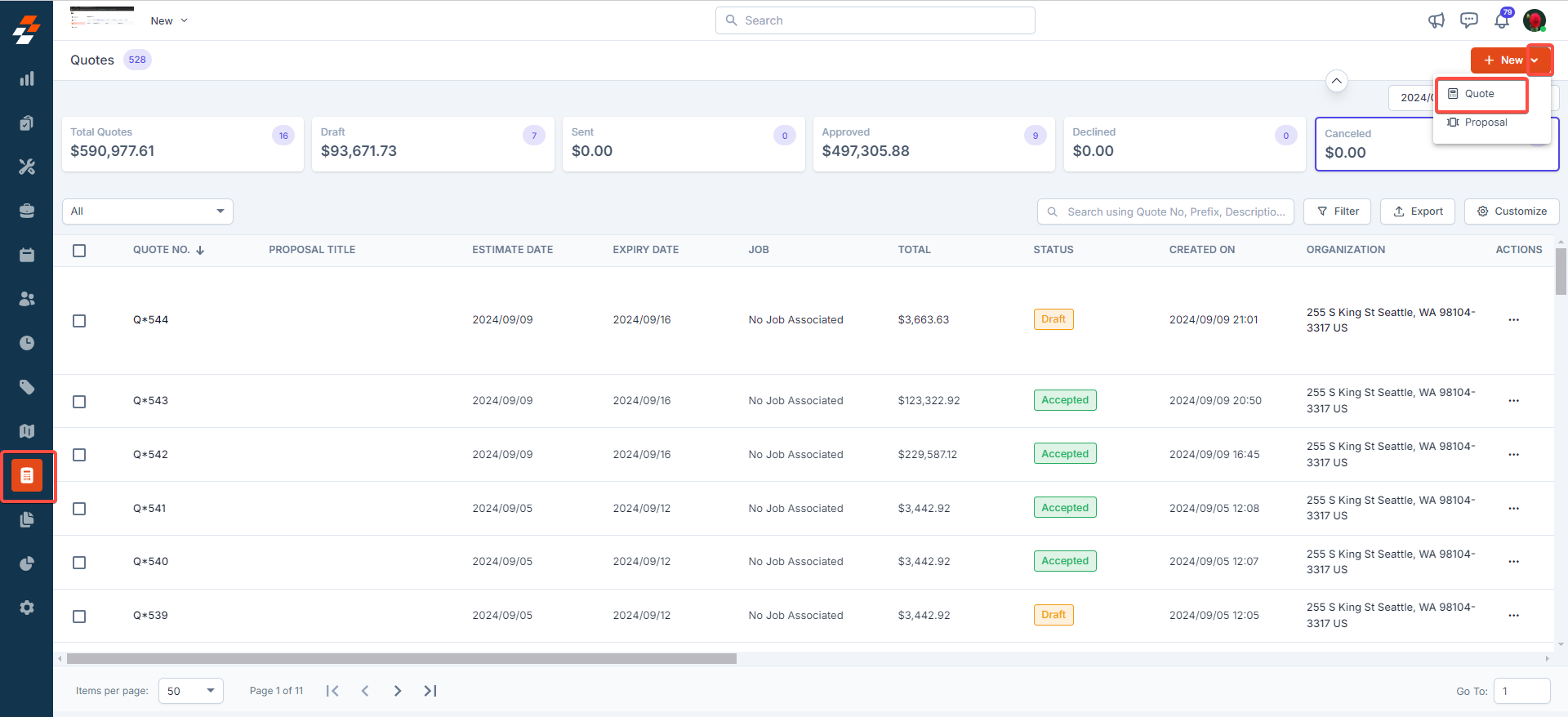 1. Go to the “Quotes” icon from the left navigation menu and choose “+ New Quote” to create a new quote.