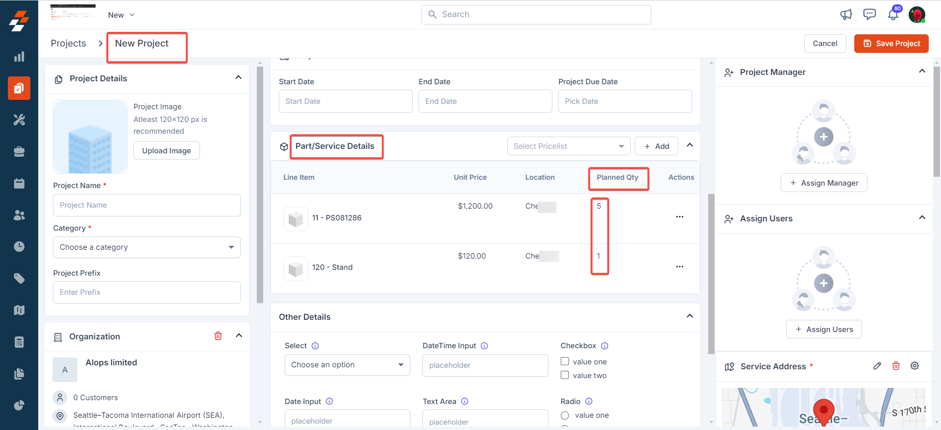 - Planned Quantity: The number of parts and/or service that are planned to be used for the project. This quantity is automatically fetched from the accepted quote containing parts and services. Additionally, any parts and services added manually will be represented as planned quantity for the project.