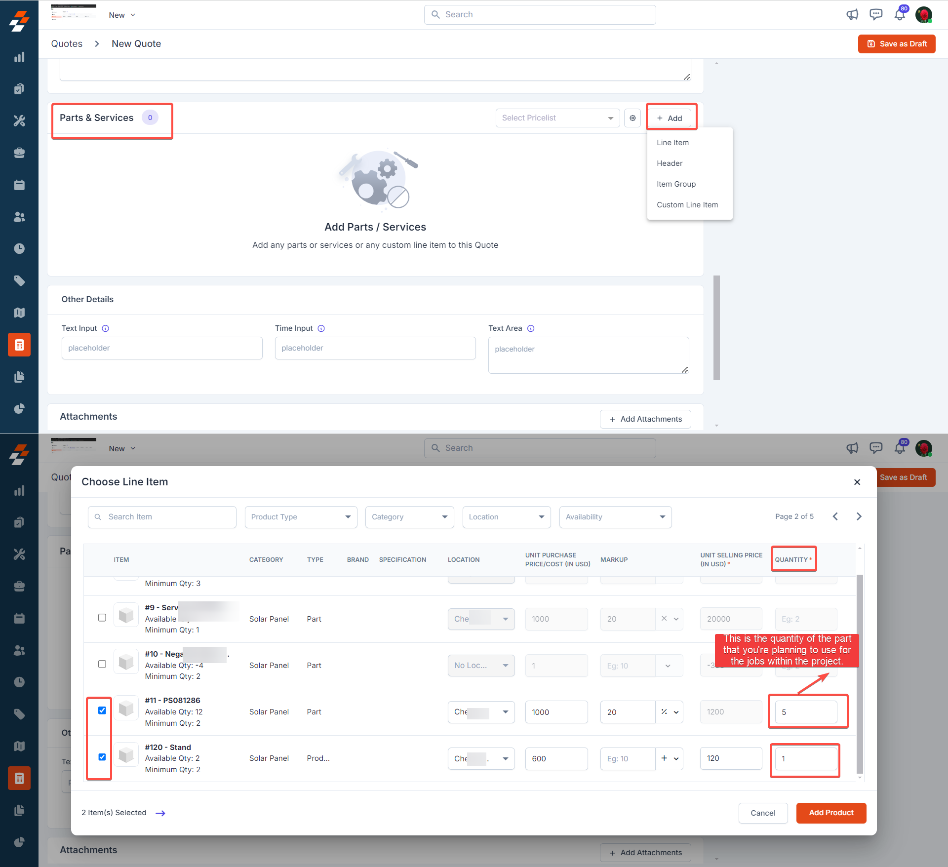 4. Click "+ Add" next to Parts & Services section to add the parts and services required for the project. Please note that the quantity of parts and services that you specify in the quote will represent the planned quantity for the project.