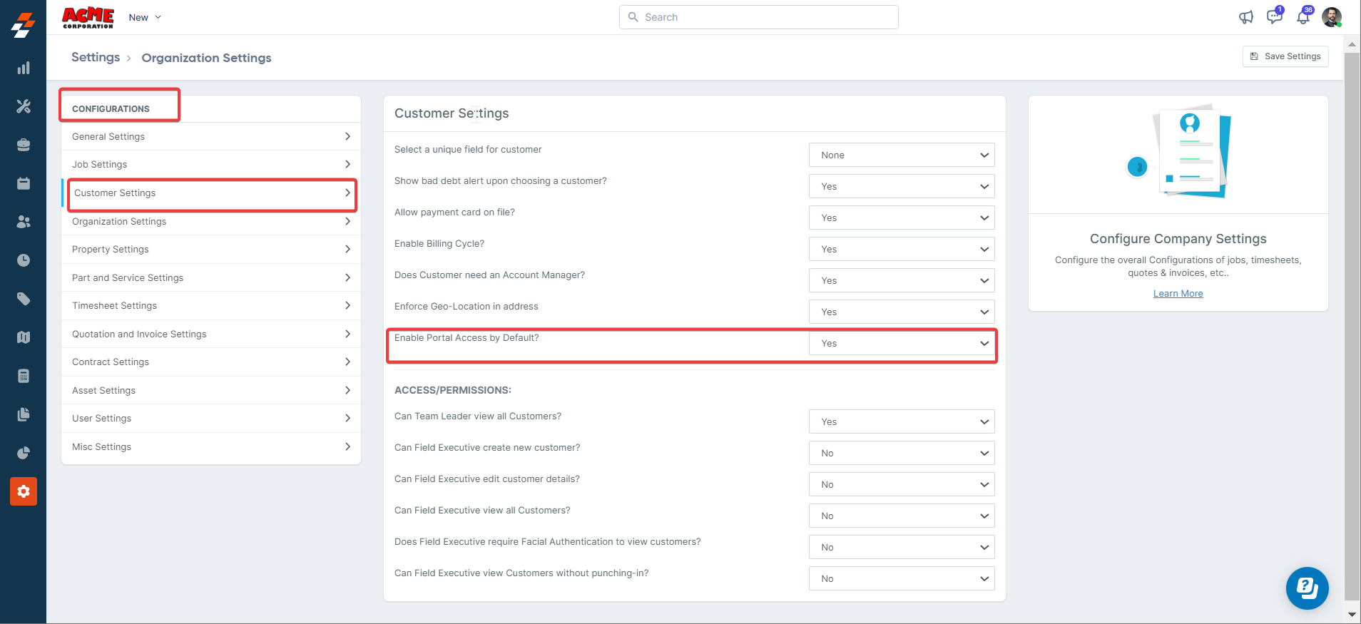 2. Under the "Configurations" select the "Customer Settings" and choose "Yes" for the "Enable Portal Access by Default."