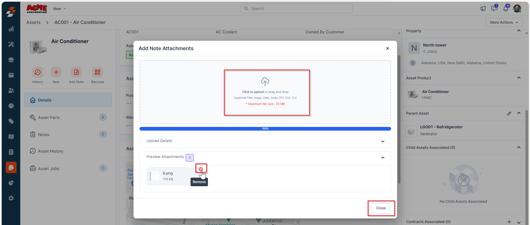 2. Click to upload or drag and drop the file from your computer. Once uploaded, click "Close". You can also preview or remove attachments as needed.