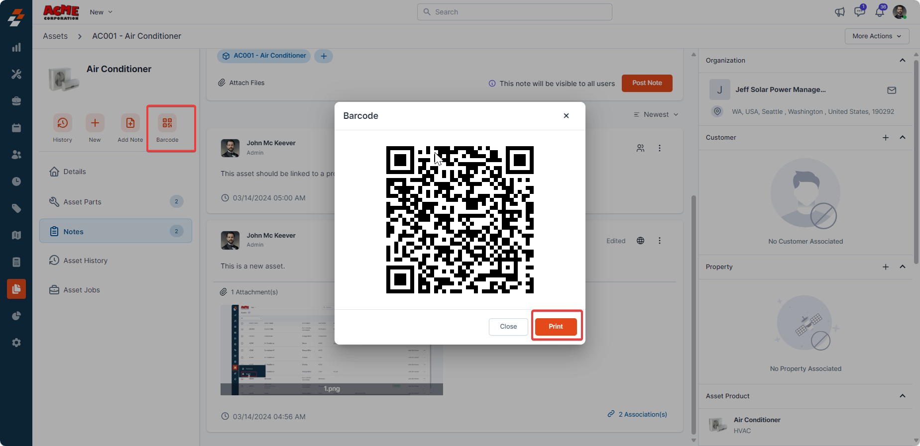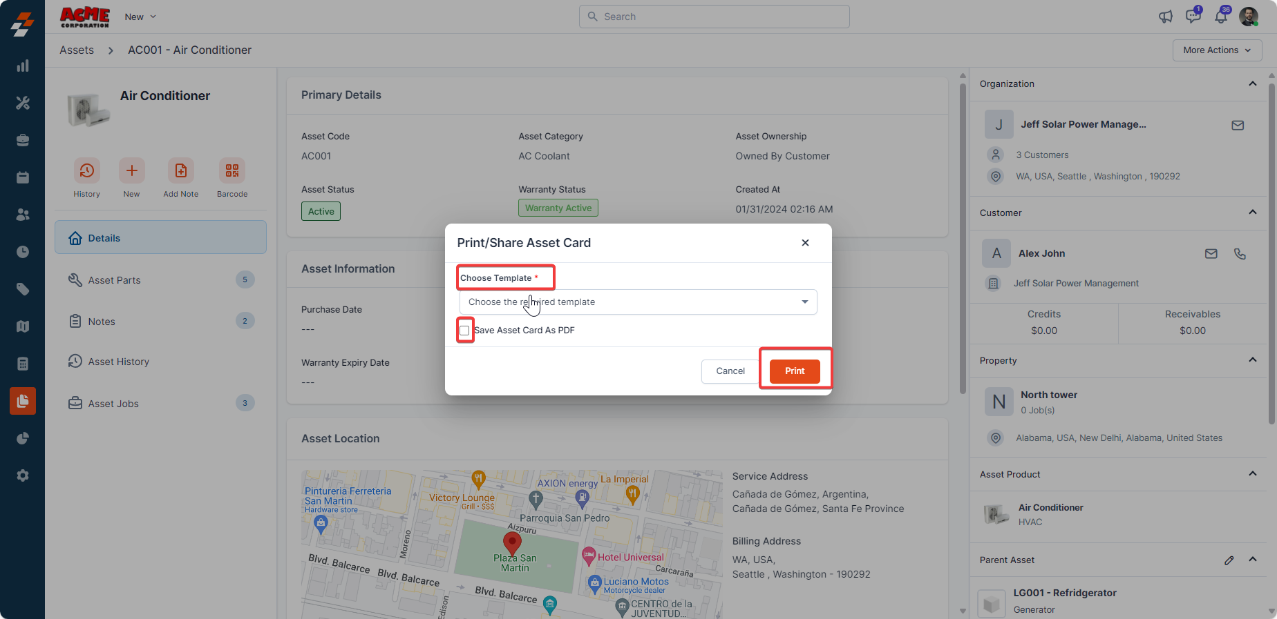 2. A pop-up appears. Choose the required template from the dropdown and check the "Save Asset card As PDF" checkbox. Once done, click the "Print" button. The Asset will be printed/saved as PDF in your computer.