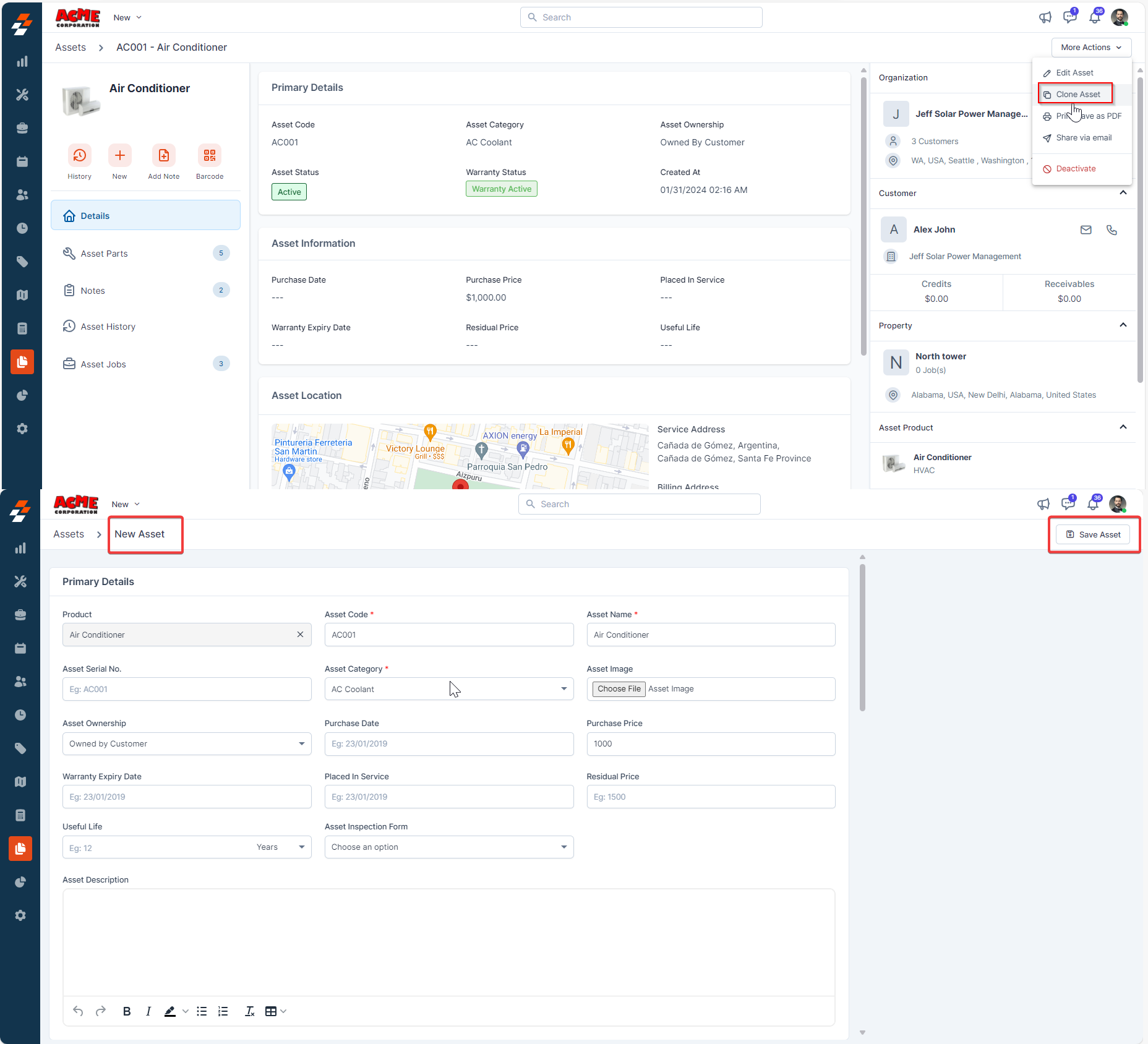 To do so, click "Clone Asset". A new page appears with existing data to create a new asset. Make necessary changes, if needed and click the "Save Asset" button to create a new asset.