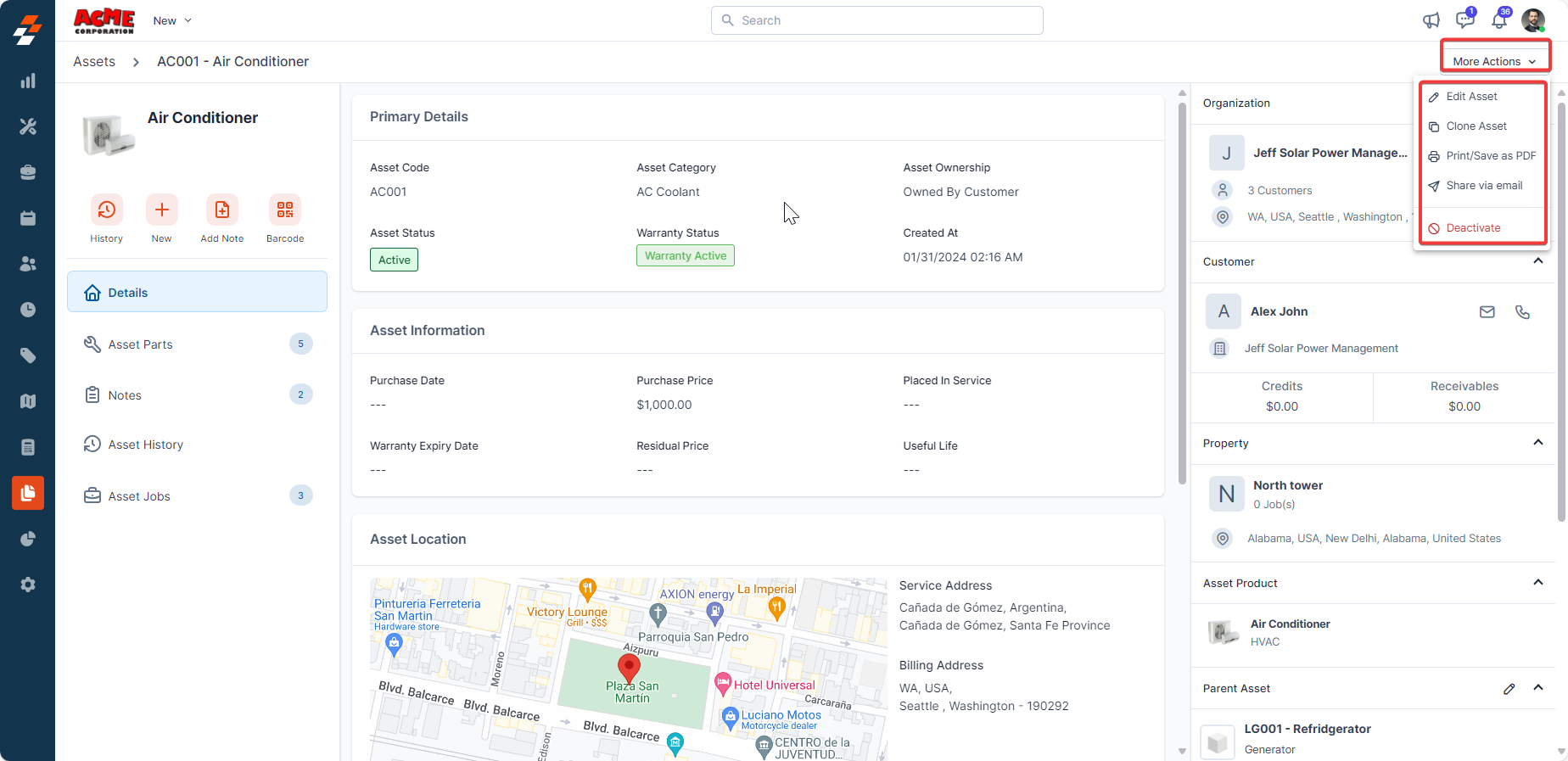 You can find "More Actions" at the top right corner of the details page. Under More actions, you can perform various actions such as edit asset, clone asset, print/save as pdf. share via email, deactivate/activate and delete an asset.