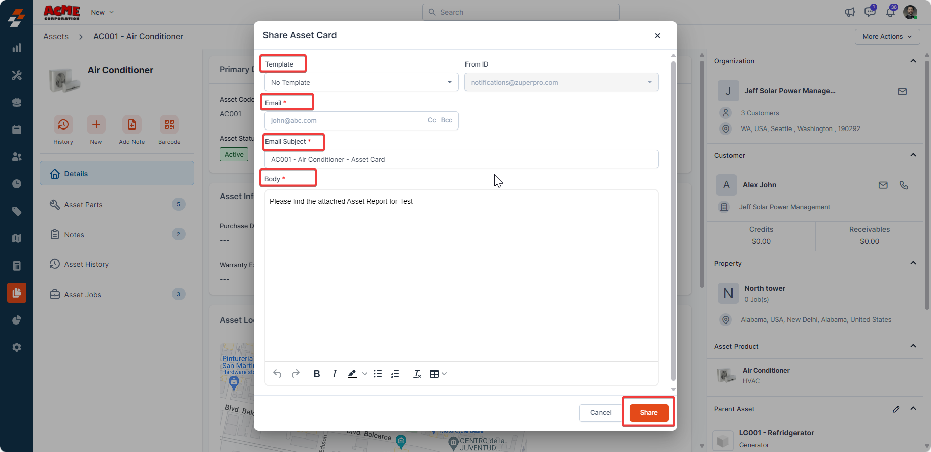 2. Provide necessary details such as email id, email subject, email body, and template. Once completed, click the "Share" button to send the asset details to respective email addresses.