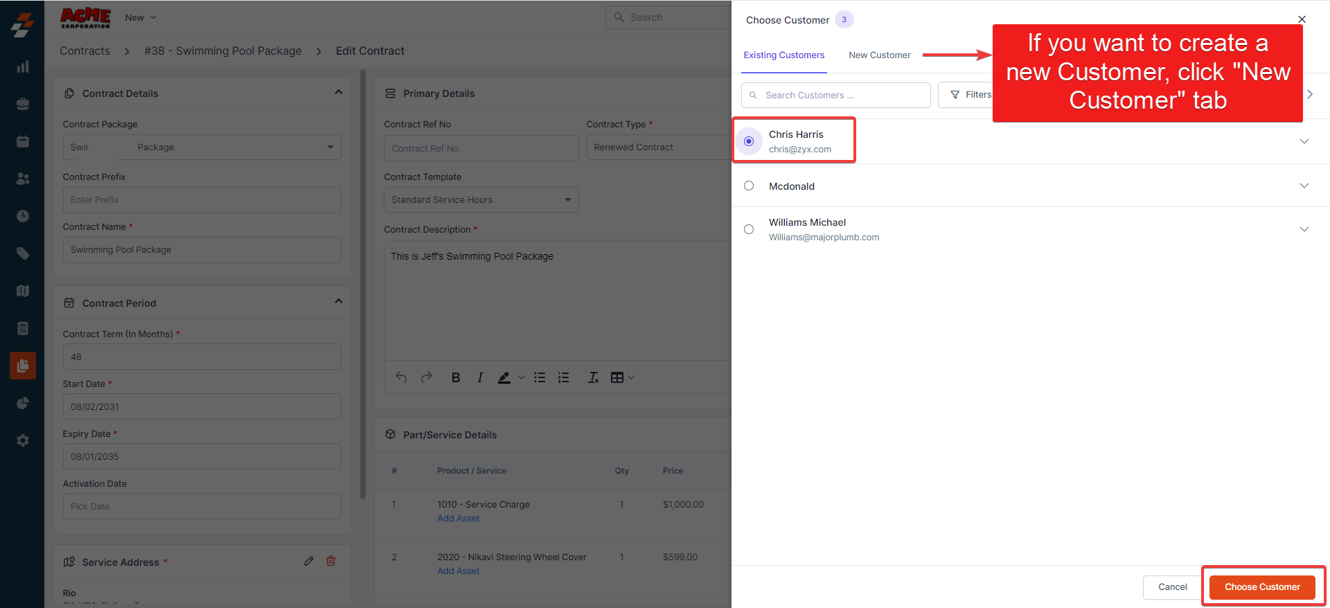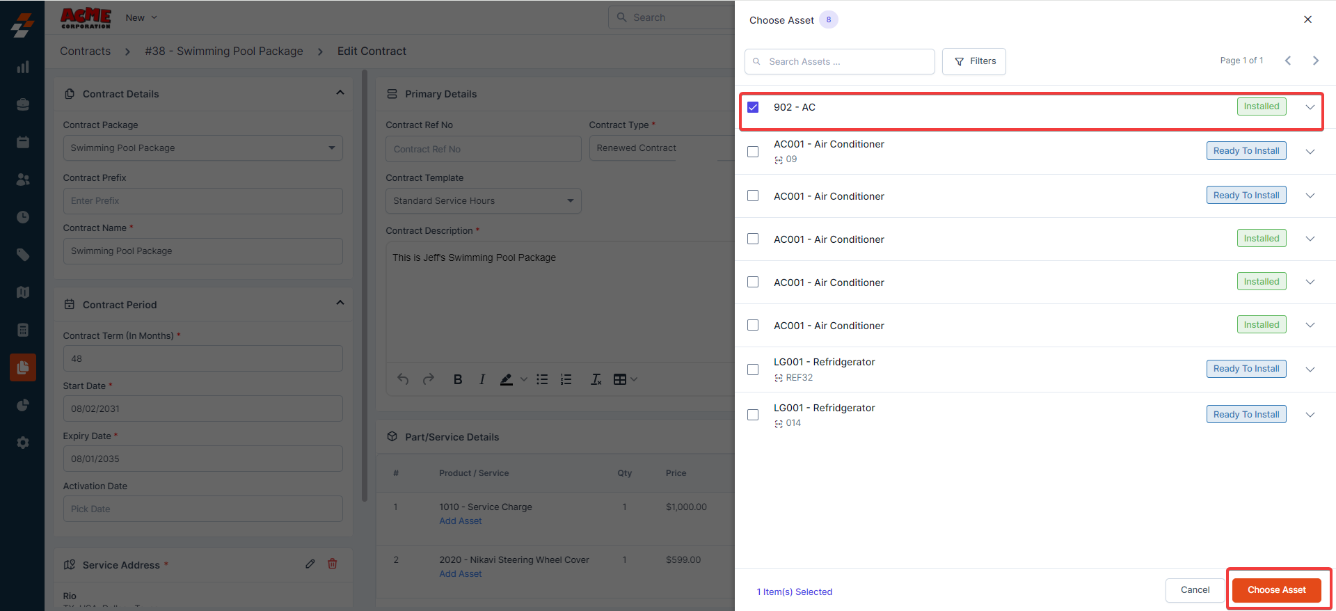 2. The "Choose Asset" side panel appears. Select the "Asset" to be added to the contract.