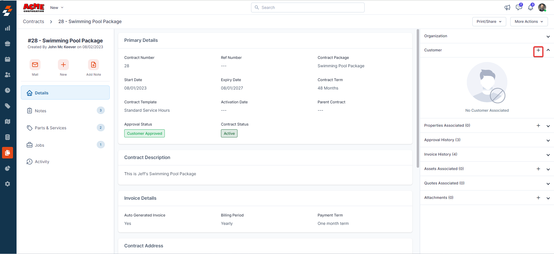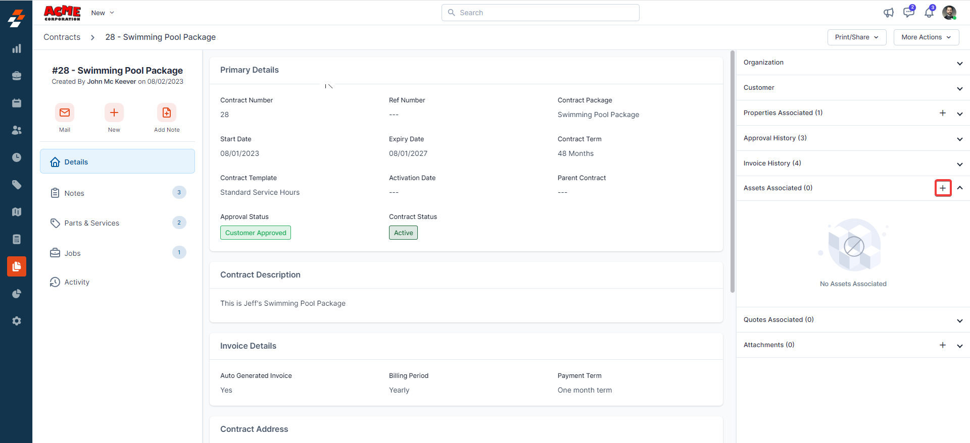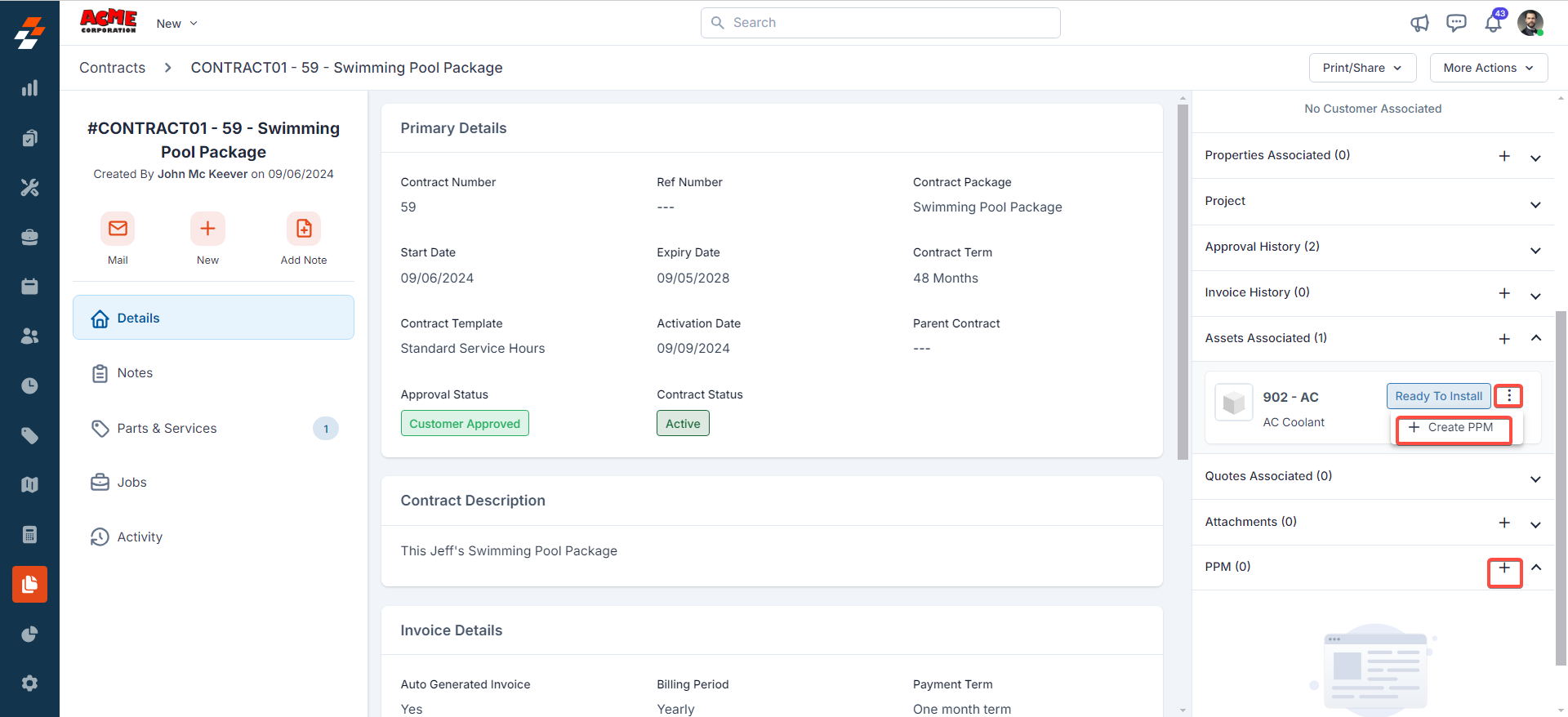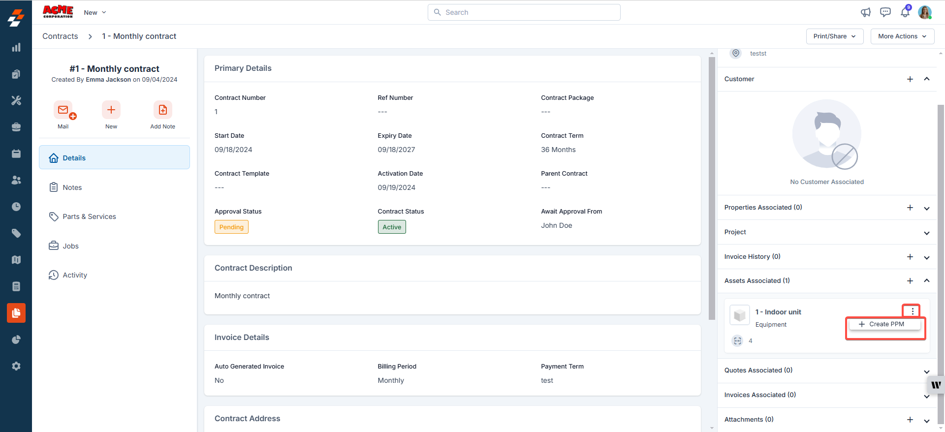 Note: You can also create a new PPM directly under the "Asset Associated" column after adding an asset. Once the PPM has been created and associated with this contract, you can view it under the "PPM" section.