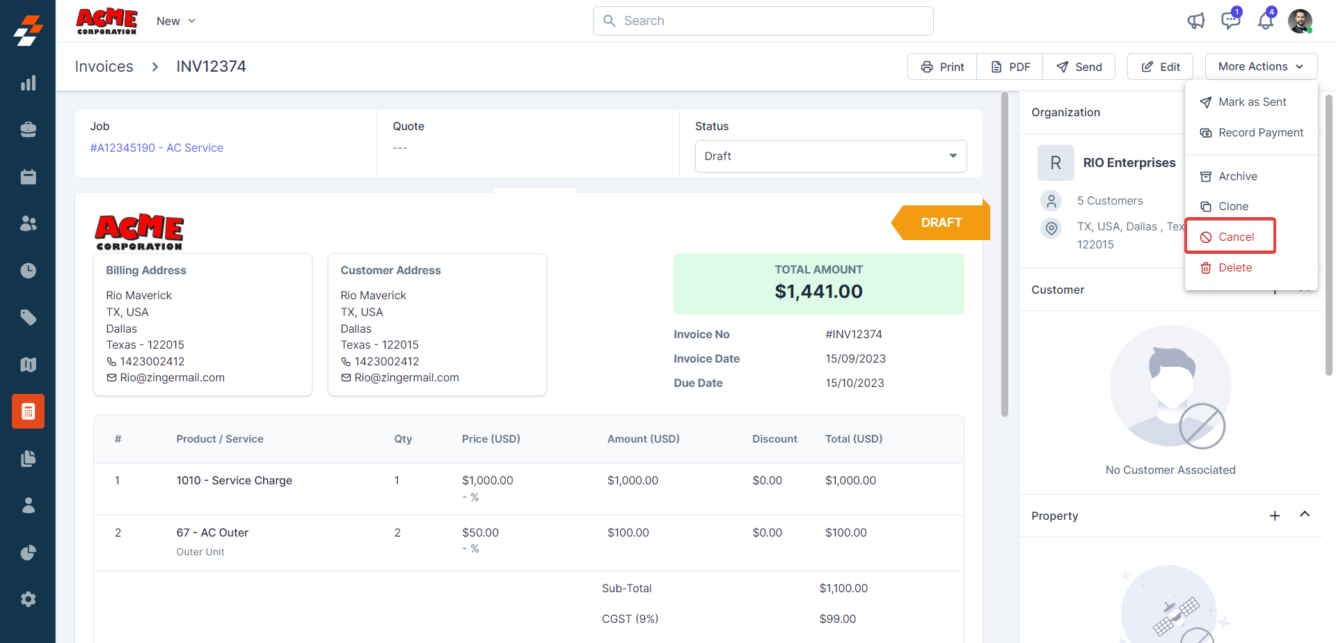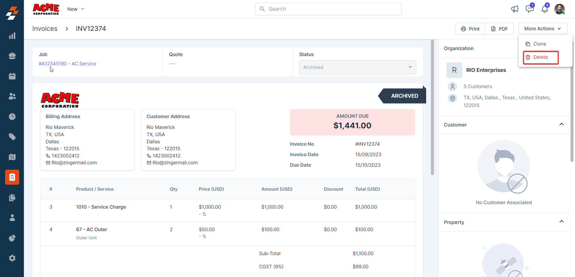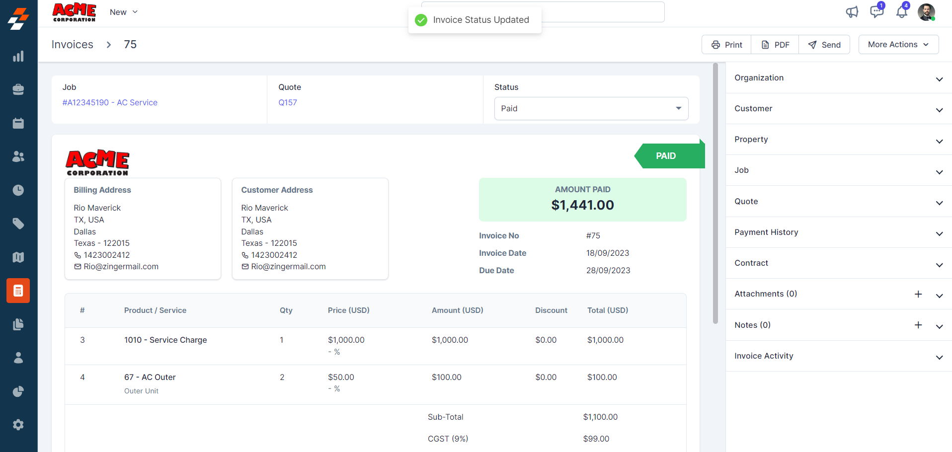 The pane 1 contains the Invoice Number, parts, and services consumed with price and quantity details. Following this information, you can notice the quick actions bar, which offers you contextual action buttons such as Clone, Archive, Edit, Cancel, and Delete invoice.