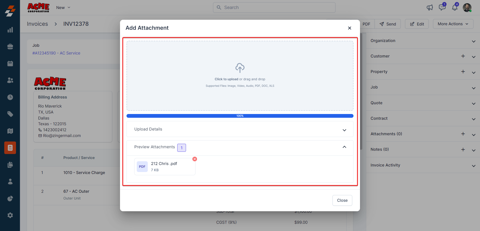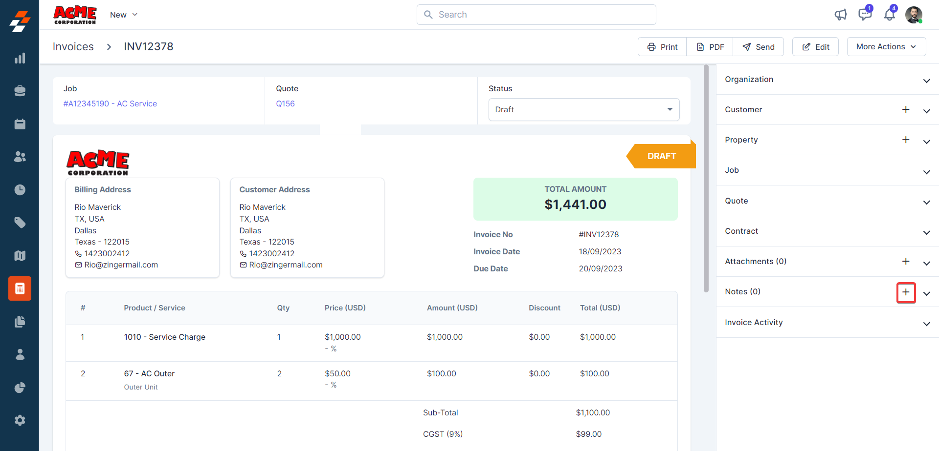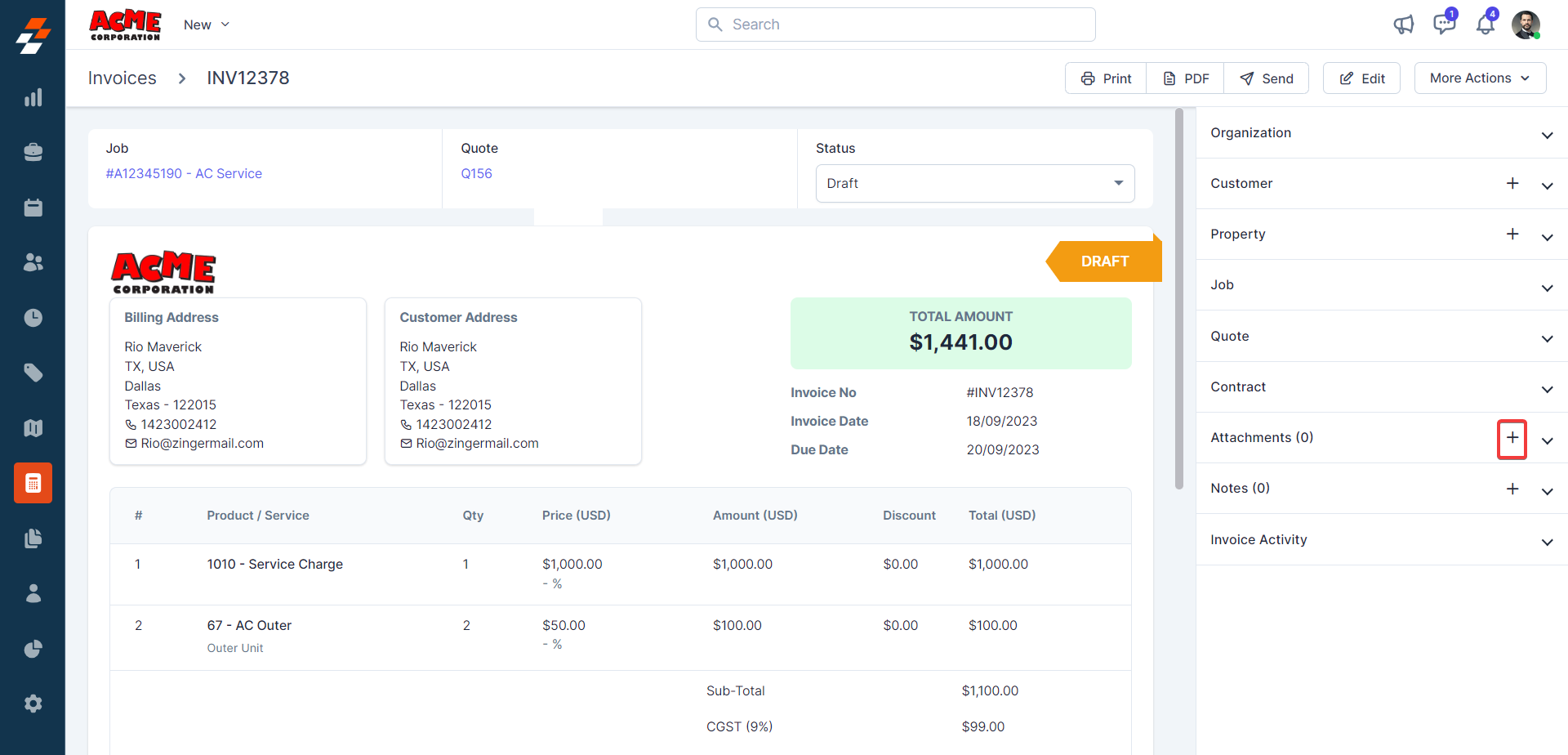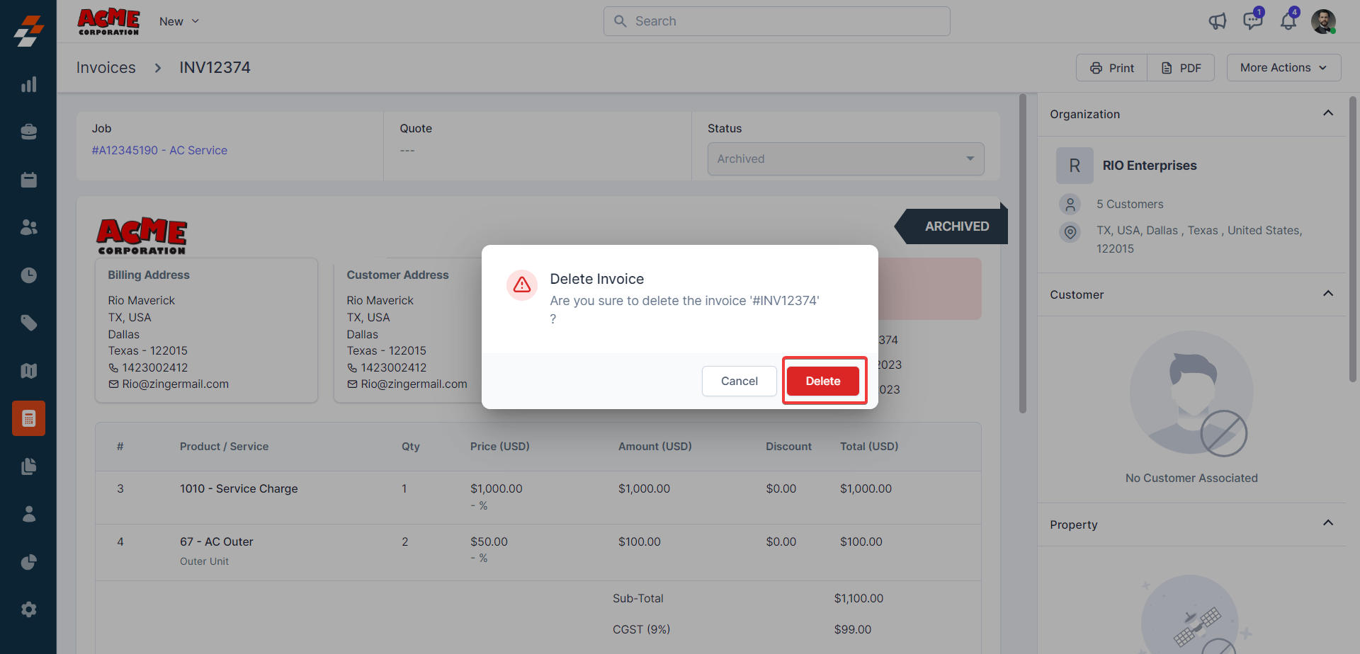 The pane 1 contains the Invoice Number, parts, and services consumed with price and quantity details. Following this information, you can notice the quick actions bar, which offers you contextual action buttons such as Clone, Archive, Edit, Cancel, and Delete invoice.