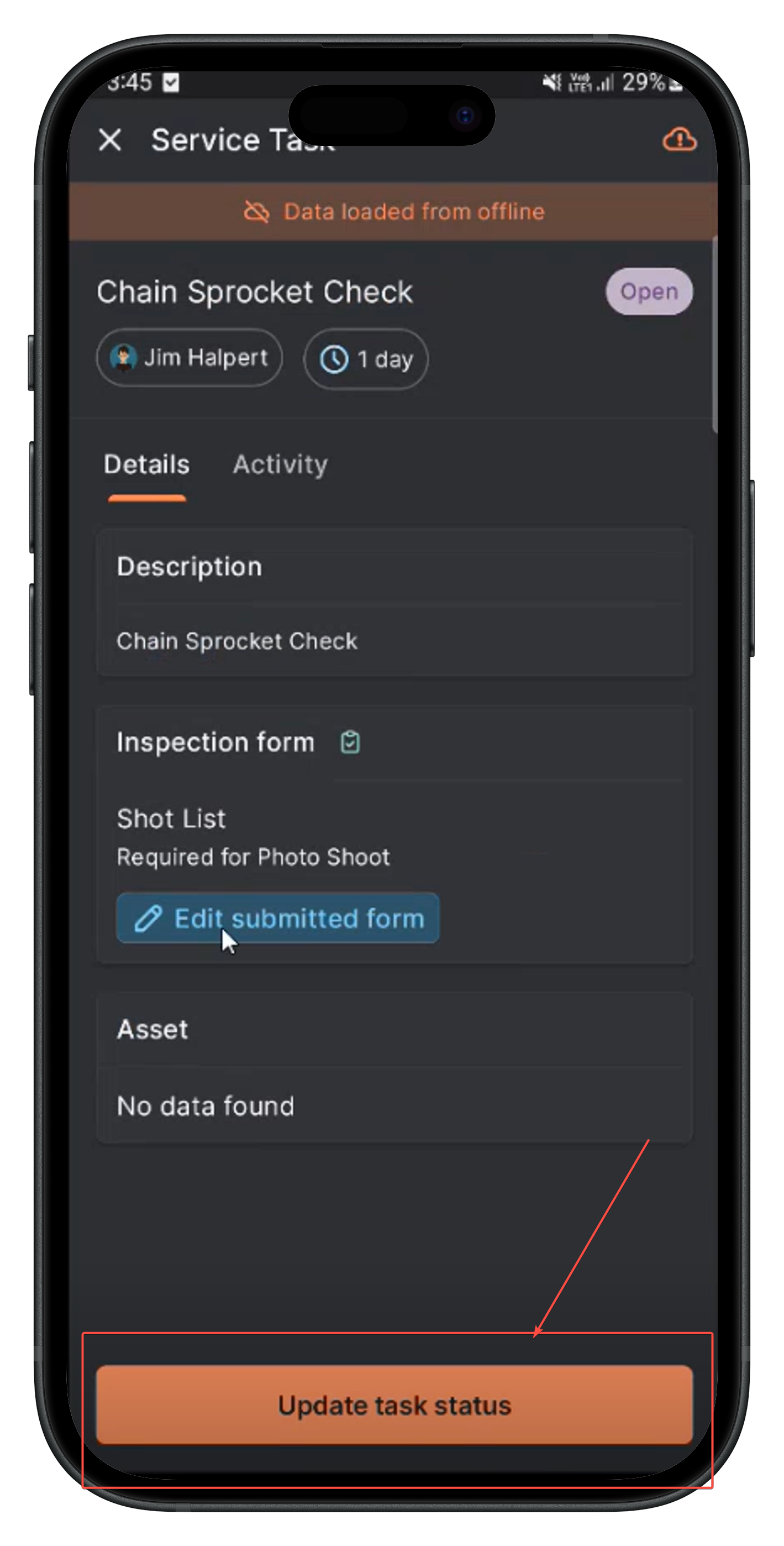 When you link an asset for the service task, it can be viewed in the service task "Details" tab.
