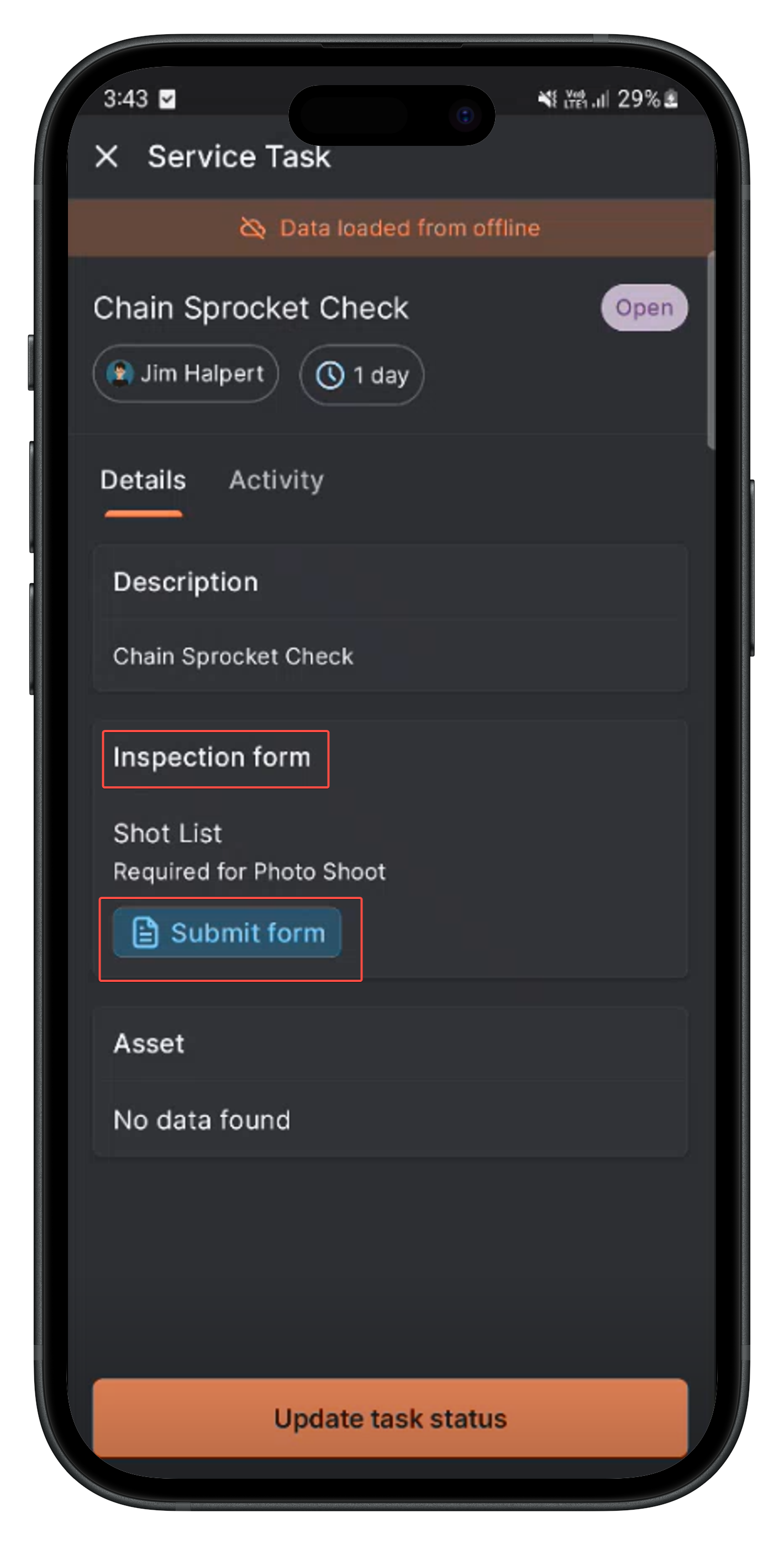 When you have associated an inspection form for the service task, you can view, fill out, and submit it from the service task’s "Details" tab.