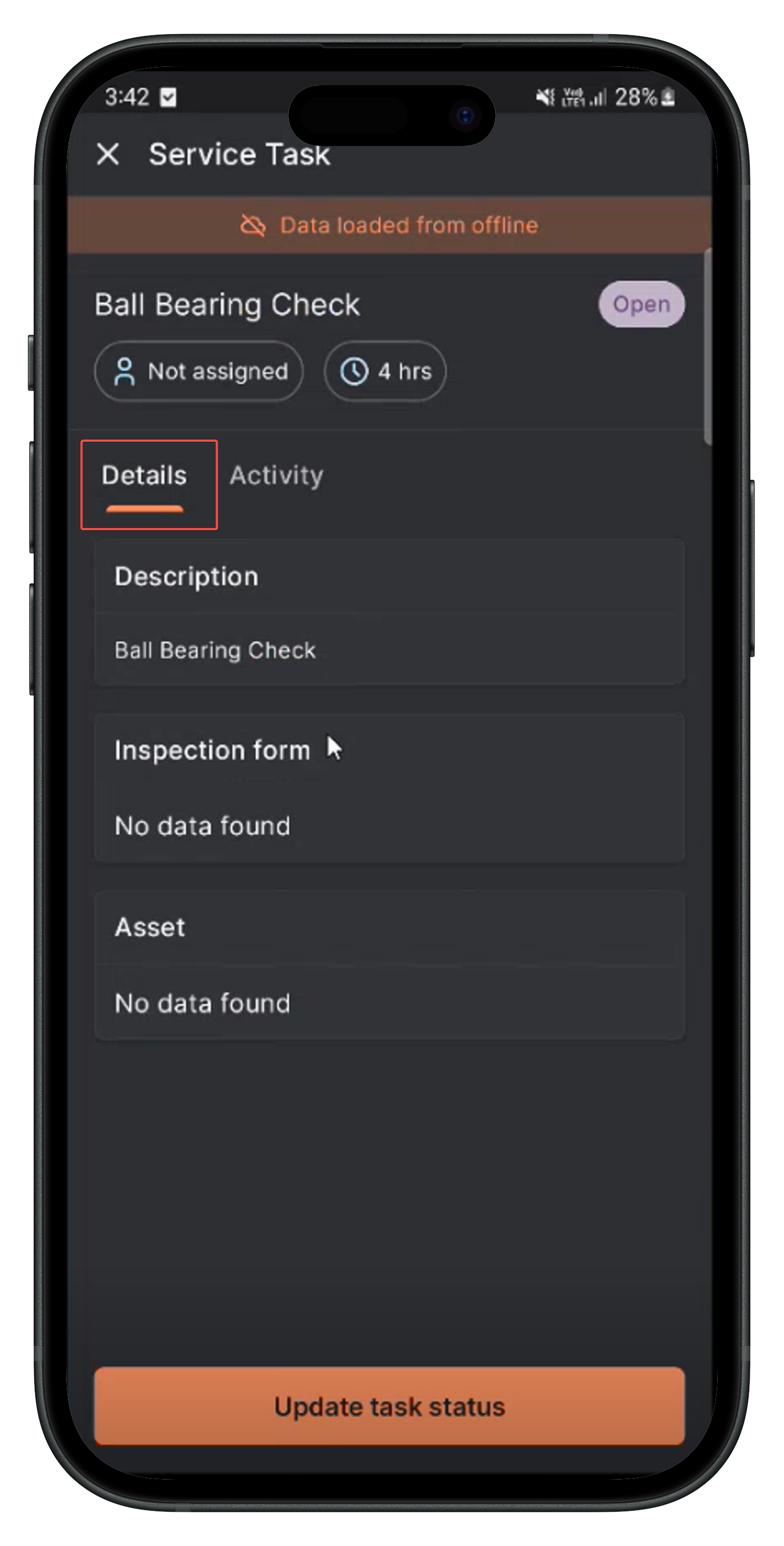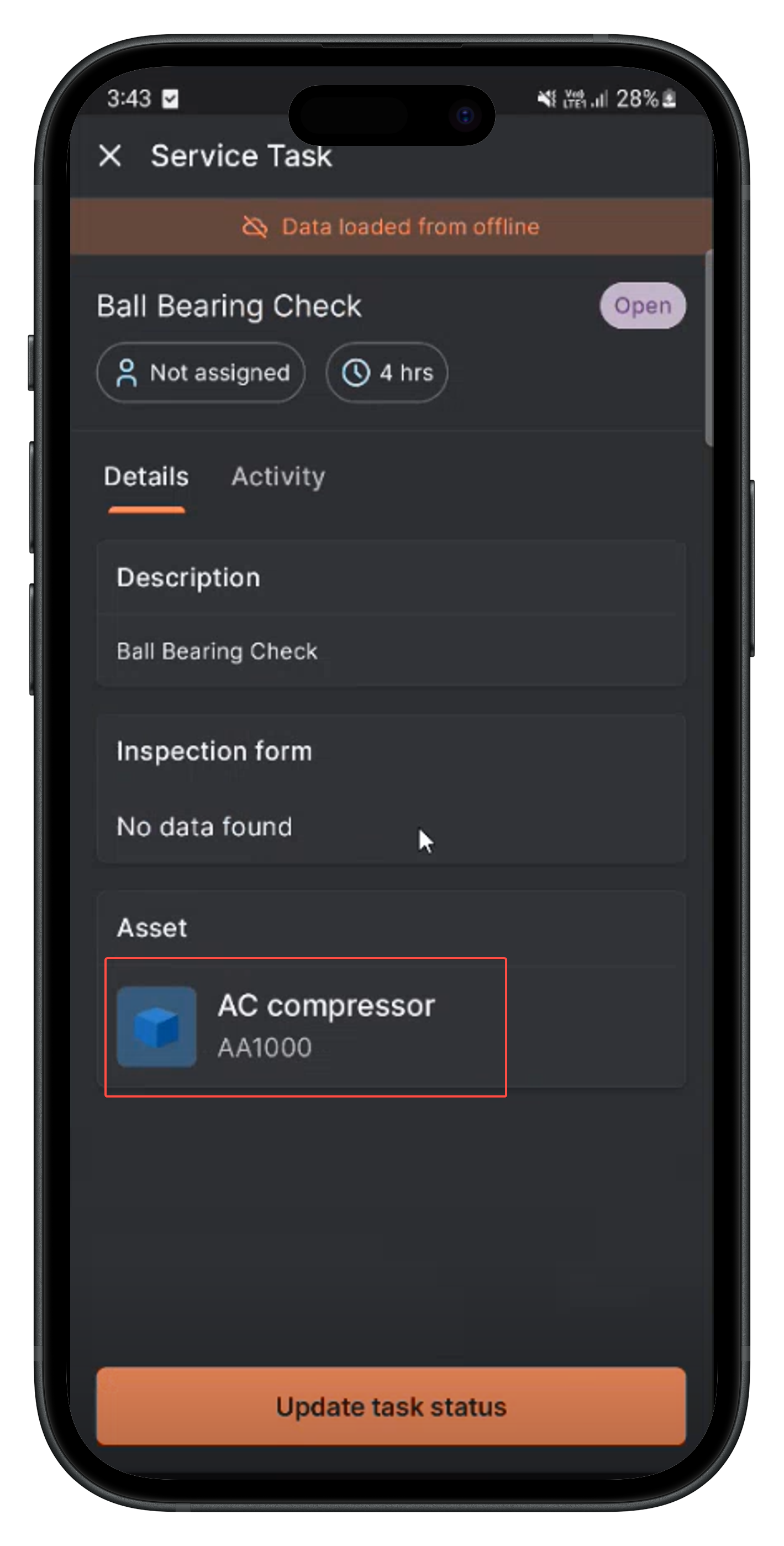 - Select the relevant service task from the list to view their details such as description, inspection form, and associated asset, if any.