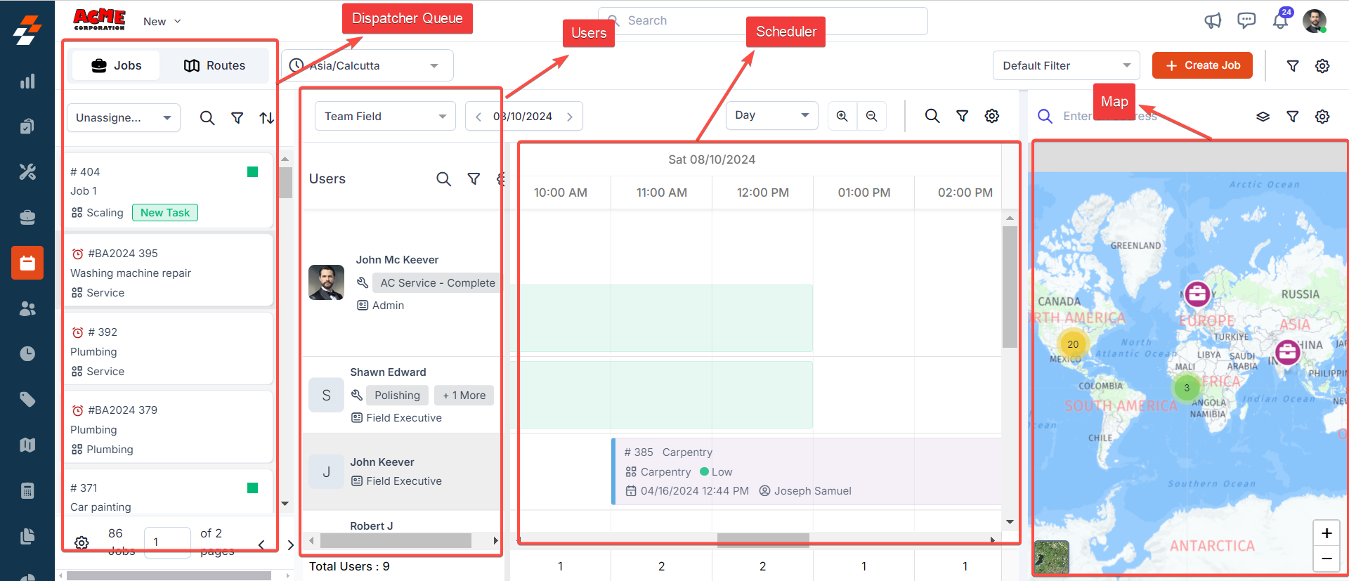 In addition to the dispatcher queue, the dispatch board includes several other interconnected layouts: Users, Scheduler and Map. These layouts work together seamlessly to provide a comprehensive view of operations and enhance the efficiency of task ...