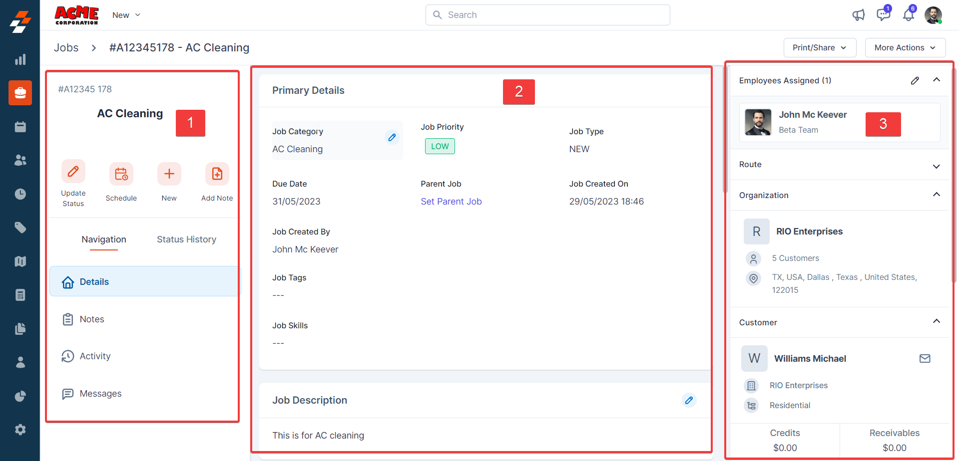Using the navigation menu, you can navigate to the various sections of the job, including Details, Notes, Activity, and Messages.