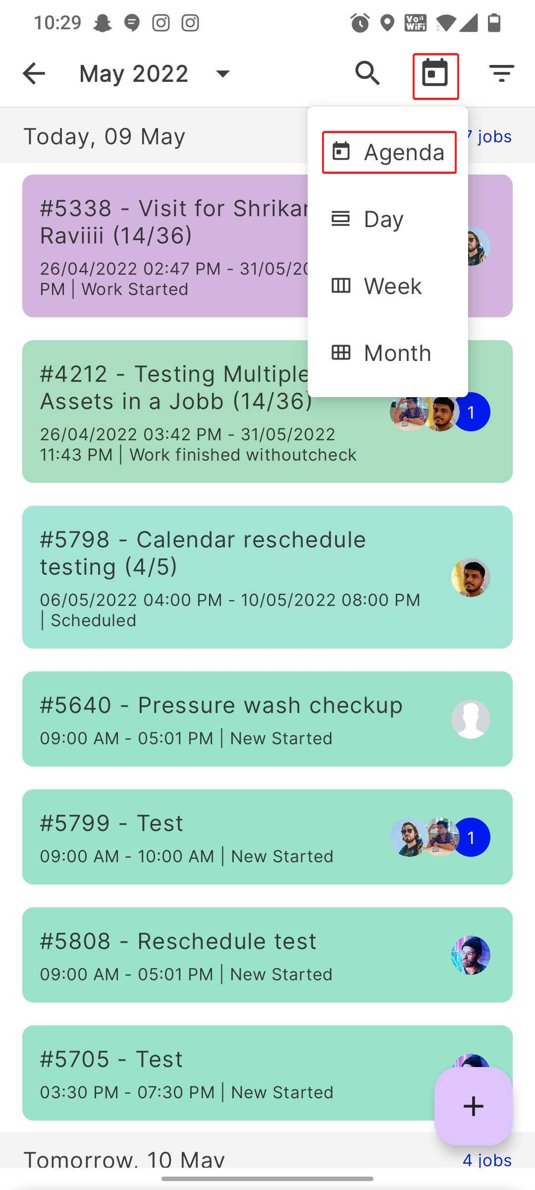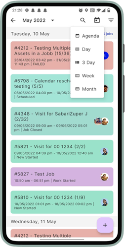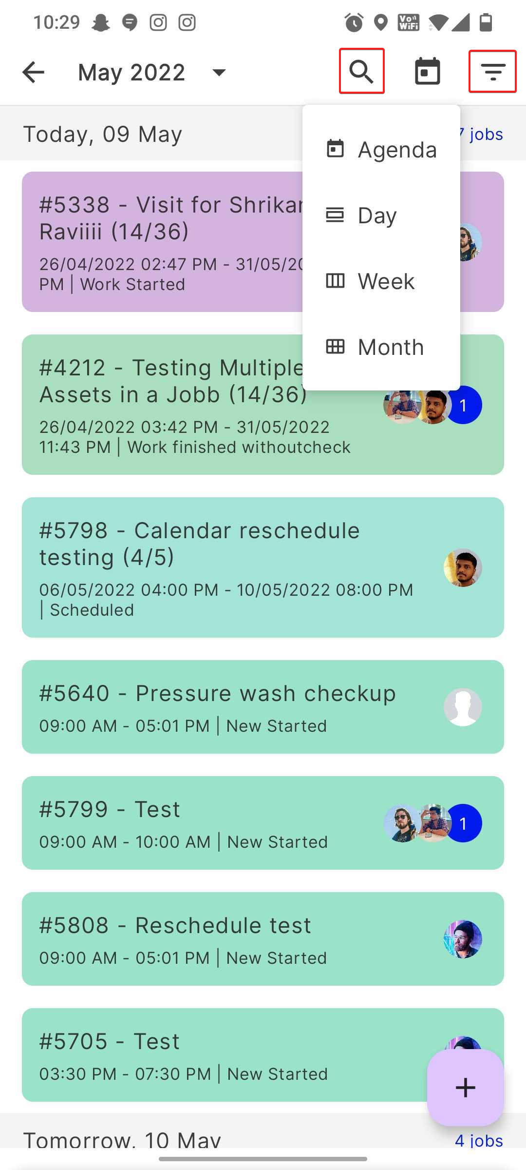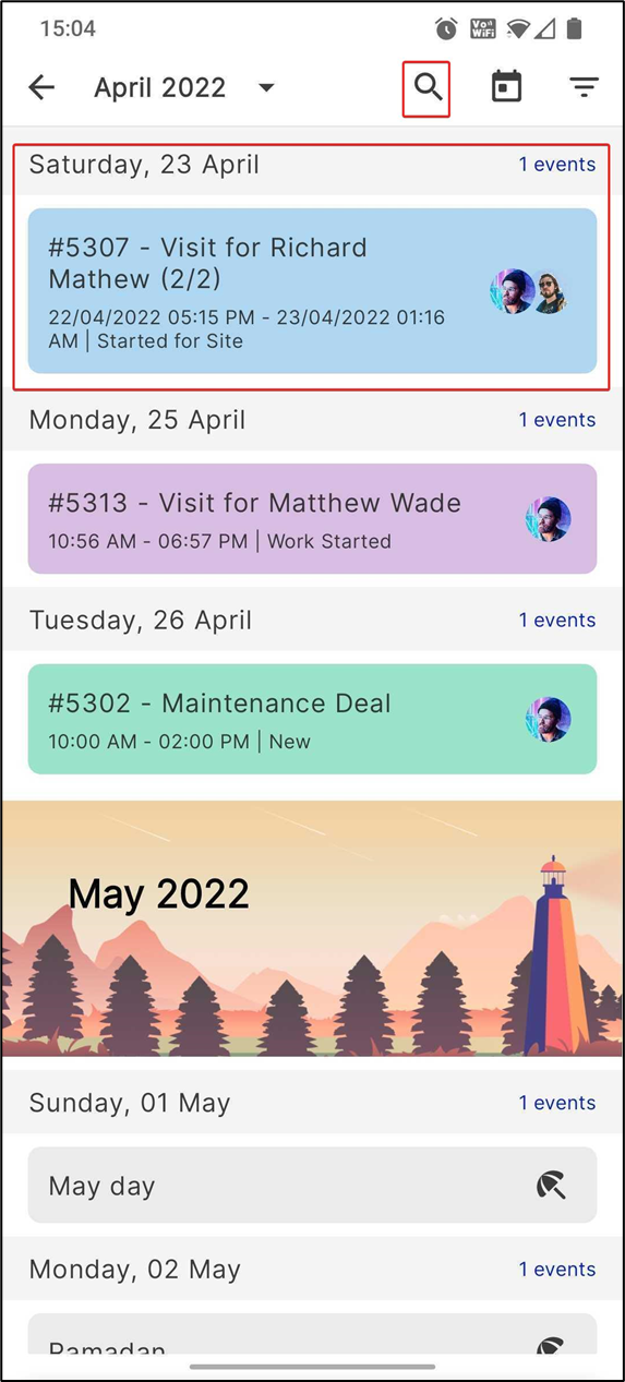 “Agenda” view shows the list of job events scheduled. Use the “Search” icon