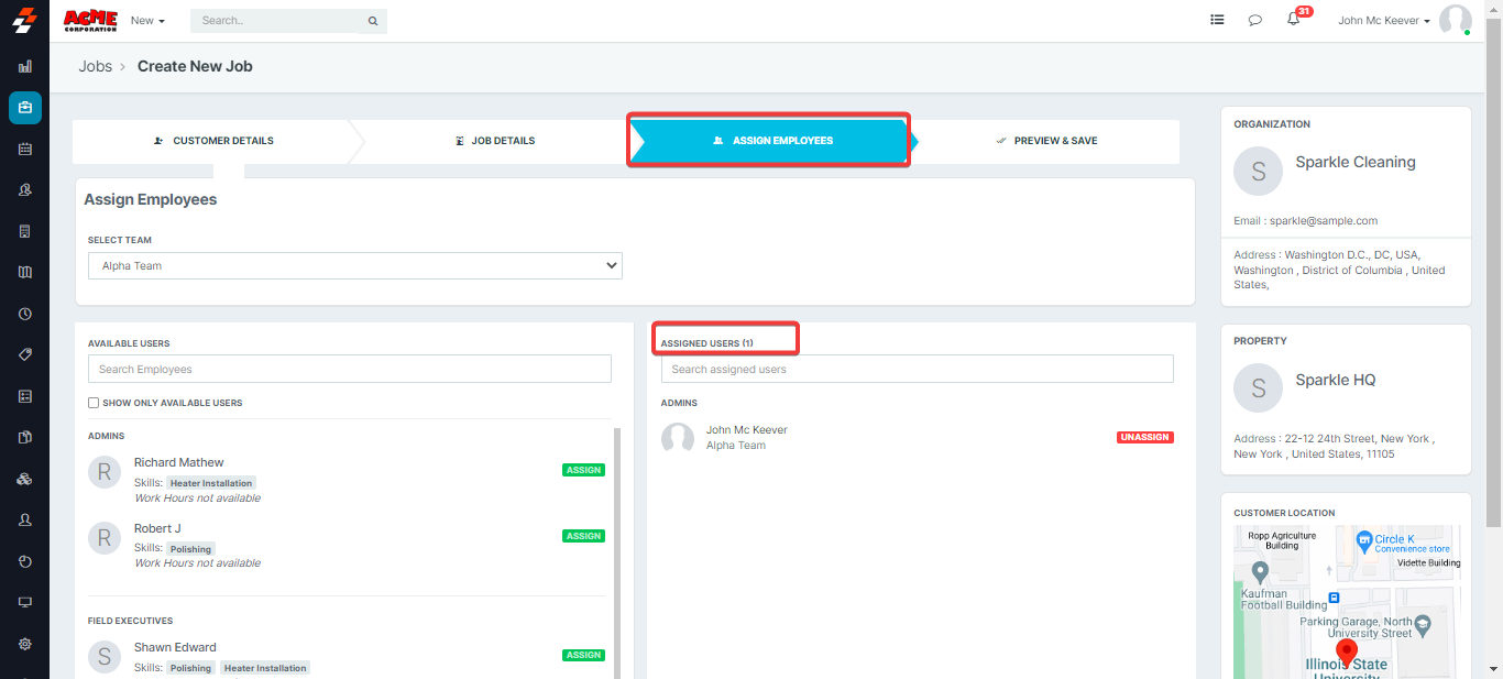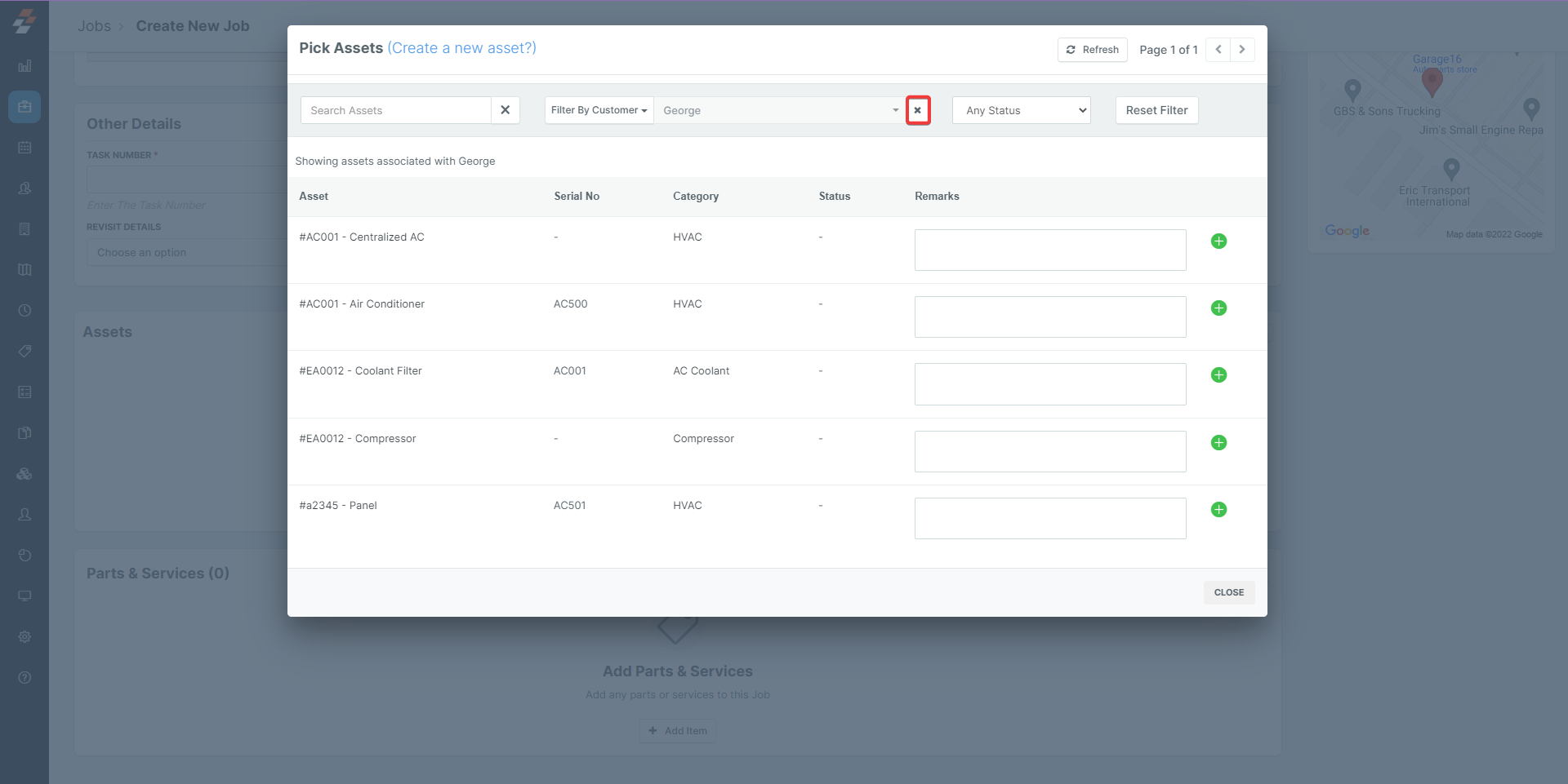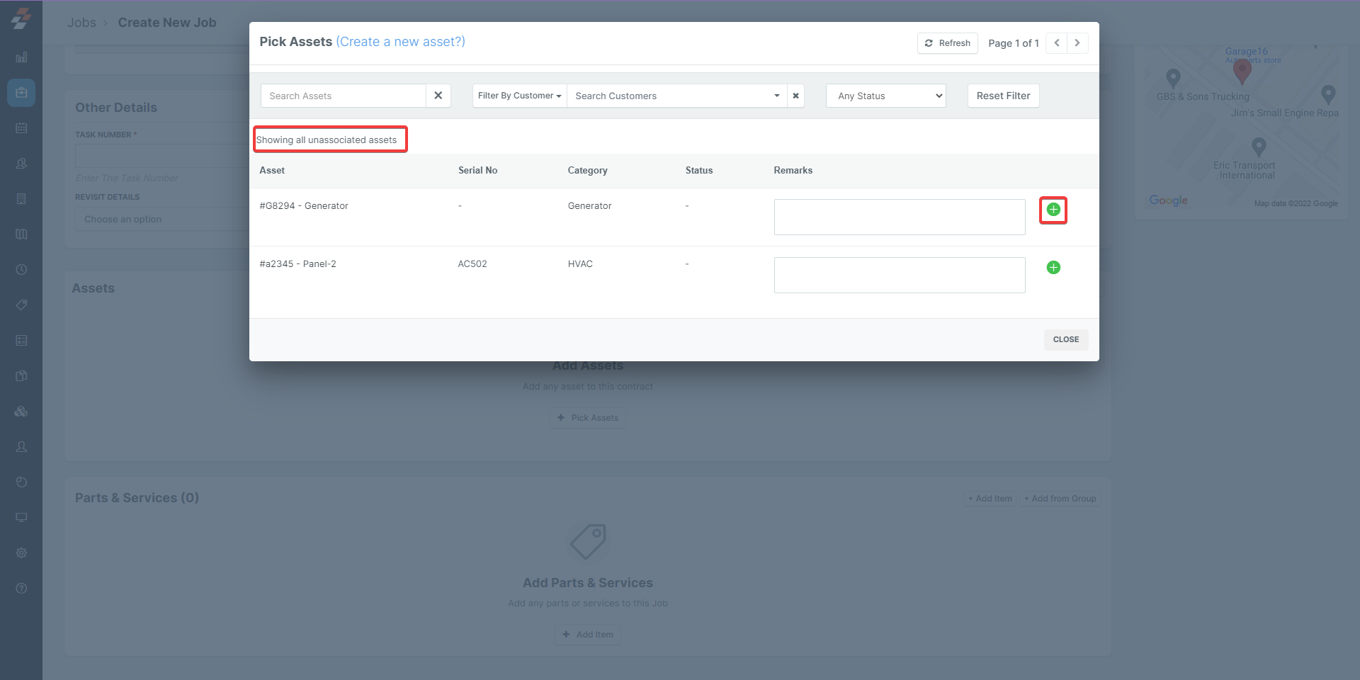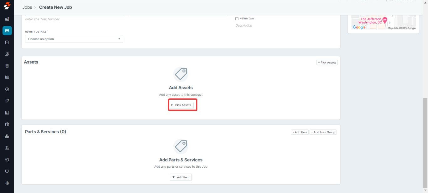 3. In the Job Details section, click on the "+ Pick Assets" field to view a list of all available assets for that specific customer.