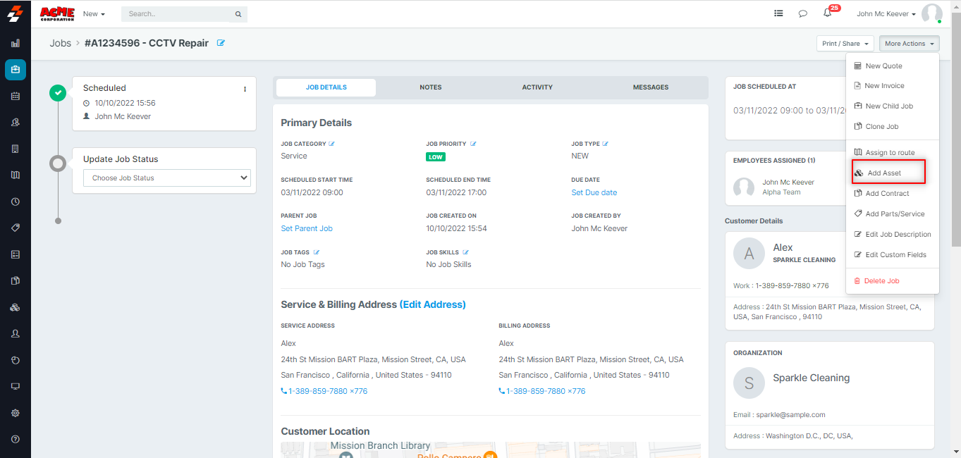 - Once the Job Details Page opens, click on the “More Actions” drop-down and select Add Asset.